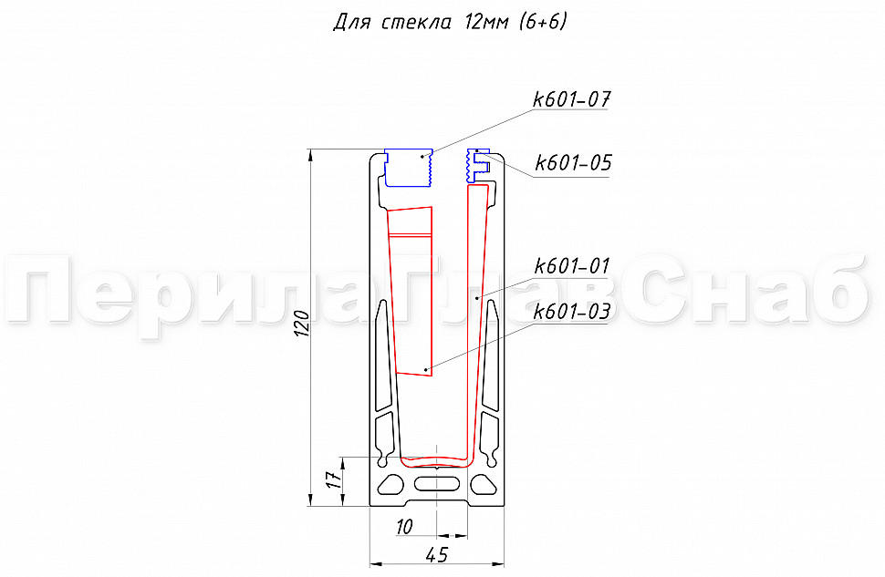 k601 — профиль для ограждений на несущем стекле ( для стеклянных ограждений). Алюминиевый профиль чаще всего используется при строительстве таких объектов, как торговые дома, бизнес-центры, отели, спортивные сооружения. Максимально допустимая высота ограждения может доходить до 1200 мм, боковая нагрузка – до 430 кг. В данной модификации профиля предусмотрены крепежные отверстия. Наличие крепежных отверстий гарантирует более удобную и быструю установку профиля на объекте.
