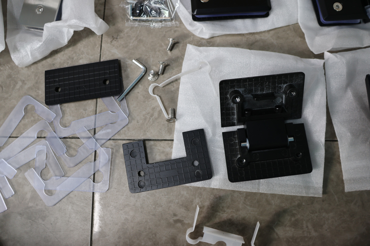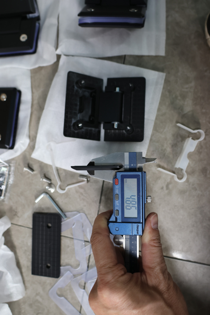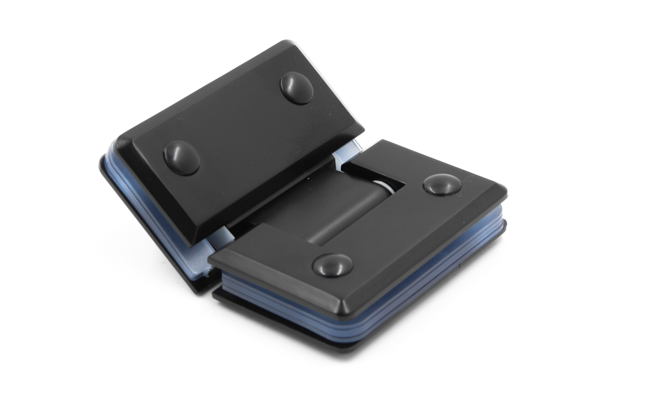 Петля стекло-стекло крепится с обеих сторон на стеклянные поверхности, плотно прижимаясь к ним своими металлическими зажимами.