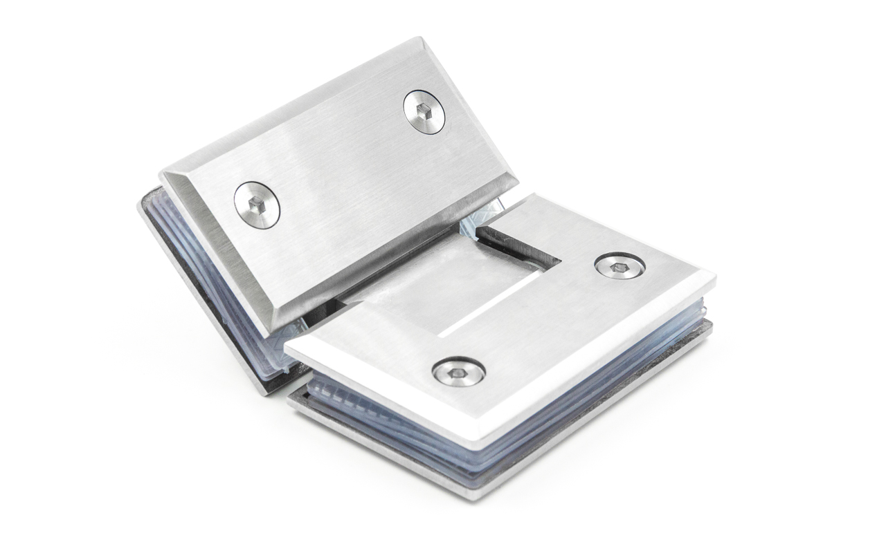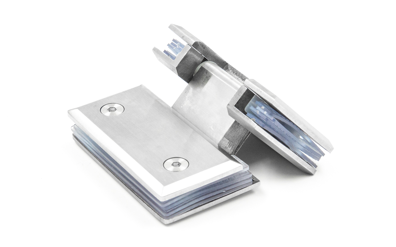Петля стекло-стекло крепится с обеих сторон на стеклянные поверхности, плотно прижимаясь к ним своими металлическими зажимами.