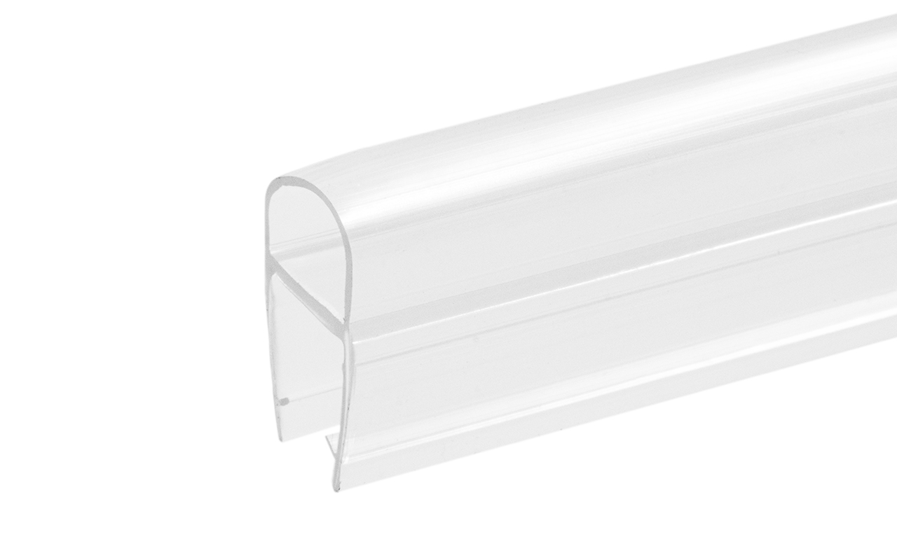 Уплотнитель имеет исполнение прозрачной поверхности, выполнен из материала ПВХ. Имеет A-образный профиль. Толщина одного типоразмера составляет 1.5 мм, длина – 2200 мм. За счет своих свойств (стойкость к щелочам, минеральным маслам и многим кислотам) прекрасно подходит для крепления стеклянного листа по всему периметру. Позволяет герметично соединять стеклянные панели с дверью, что гарантируют отсутствие течи в вертикальной части конструкции.
