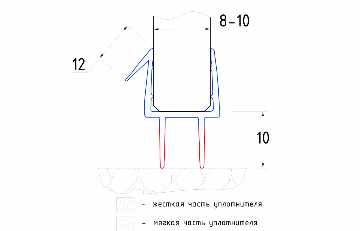 Уплотнитель имеет исполнение черной полупрозрачной поверхности, выполнен из материала ПВХ. Имеет. За счет своих свойств (стойкость к щелочам, минеральным маслам и многим кислотам) прекрасно подходит для крепления стеклянного листа по всему периметру. Позволяет герметично соединять стеклянные панели со стеной, что гарантируют отсутствие течи в вертикальной части конструкции. Этот уплотнитель применим в сочетании со стеклом толщиной до 8 мм. Лучше всего подходит для установки в пол.