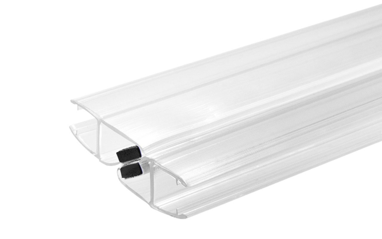 Комплект из двух профилей с магнитом. Монтируется по всему периметру стеклянного листа. Позволяет герметично соединять стеклянные панели между собой благодаря встроенному магниту. Толщина одного типоразмера составляет 1.5 мм, длина – 2200 мм. За счет своих свойств (стойкость к щелочам, минеральным маслам и многим кислотам) прекрасно подходит для крепления стеклянного листа по всему периметру. Применение этого комплекта гарантирует отсутствие течи в вертикальной части конструкции. Уплотнитель из комплекта применим в сочетании со стеклом толщиной до 8 мм и углом в плане до 90 и 180.