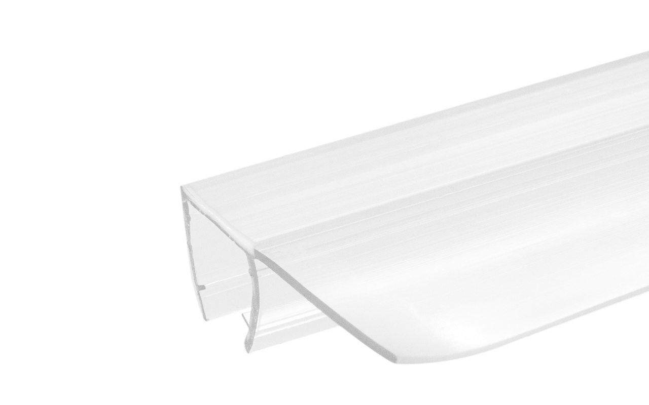 Уплотнитель имеет исполнение прозрачной поверхности, выполнен из материала ПВХ. Имеет F-образный профиль. Толщина одного типоразмера составляет 1.5 мм, длина – 2200 мм. За счет своих свойств (стойкость к щелочам, минеральным маслам и многим кислотам) прекрасно подходит для крепления стеклянного листа по всему периметру. Позволяет герметично соединять стеклянные панели, что гарантируют отсутствие течи в вертикальной части конструкции. Этот уплотнитель применим в сочетании со стеклом толщиной до 8 мм и углом в плане до 90.
