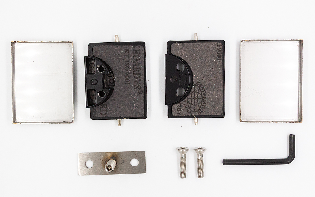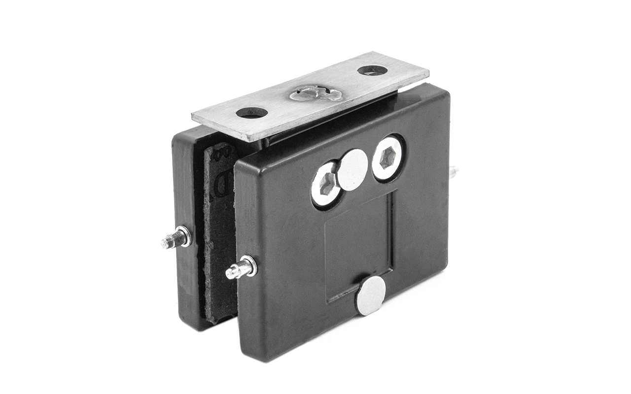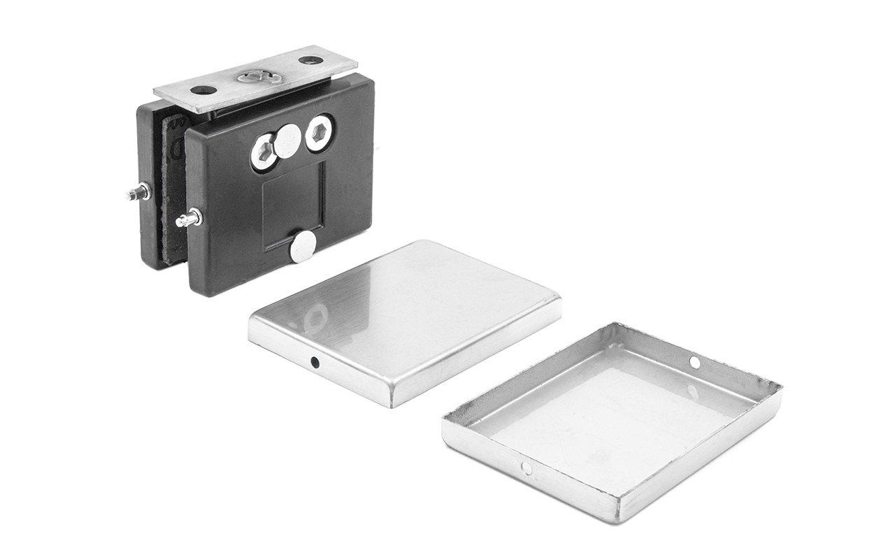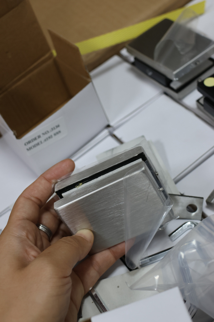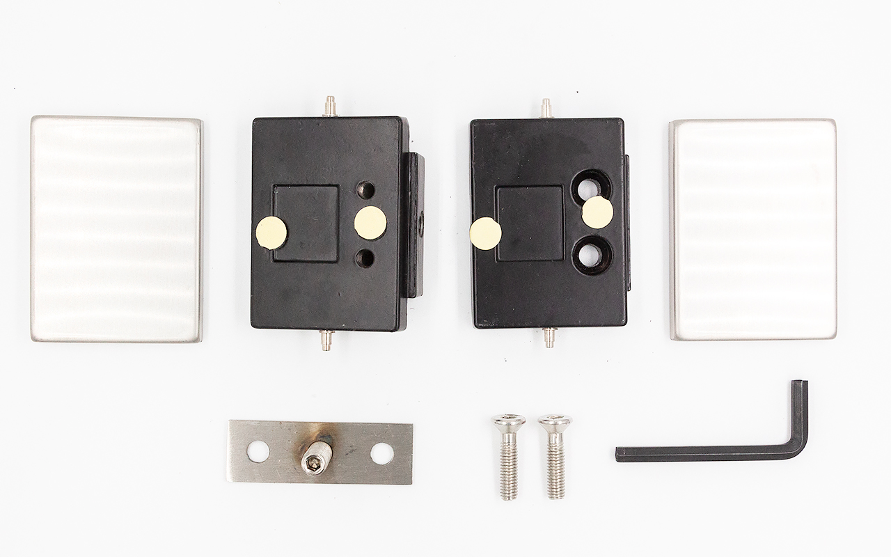 Коннектор разбирается на две половинки, основание металлической пластины крепится к стене на саморезы. Затем к нему прикладывается стекло со специальными полукруглыми вырезами, а далее второй половинкой стекло зажимается.
