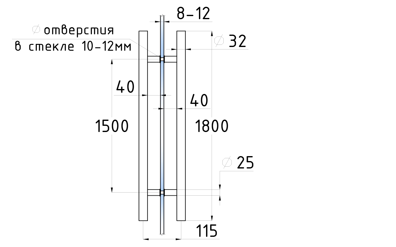 Ручка для стеклянной двери рейлинг двухсторонняя для стекла 8-12 мм, 32х1500х1800 мм, полированная, марка стали- AISI 304