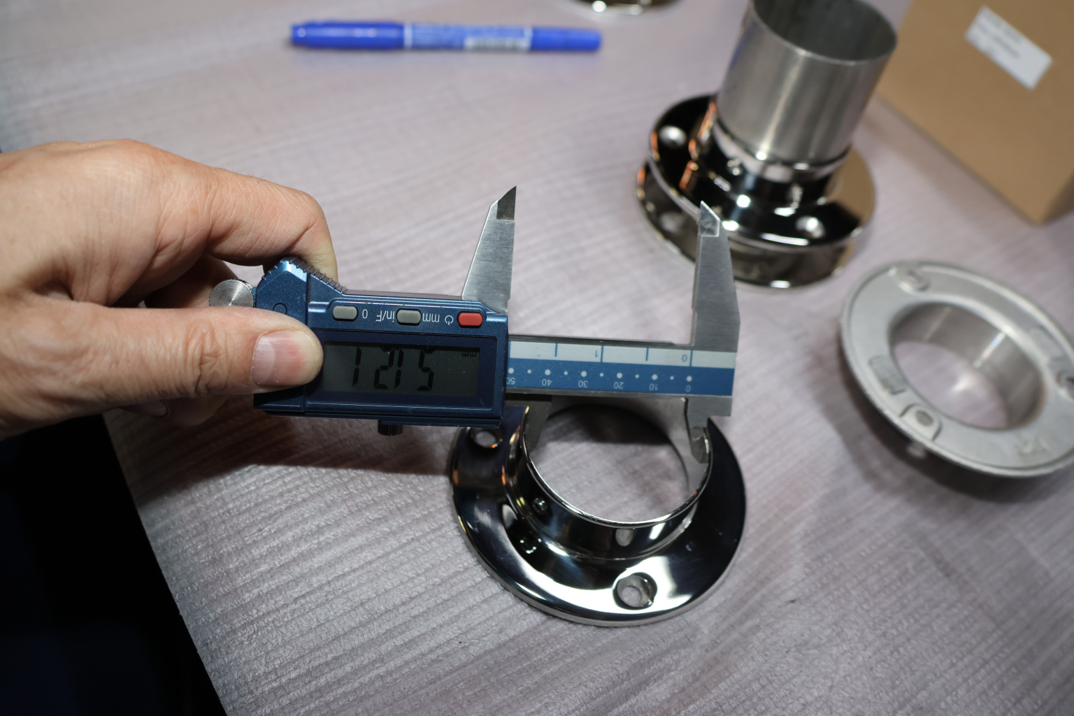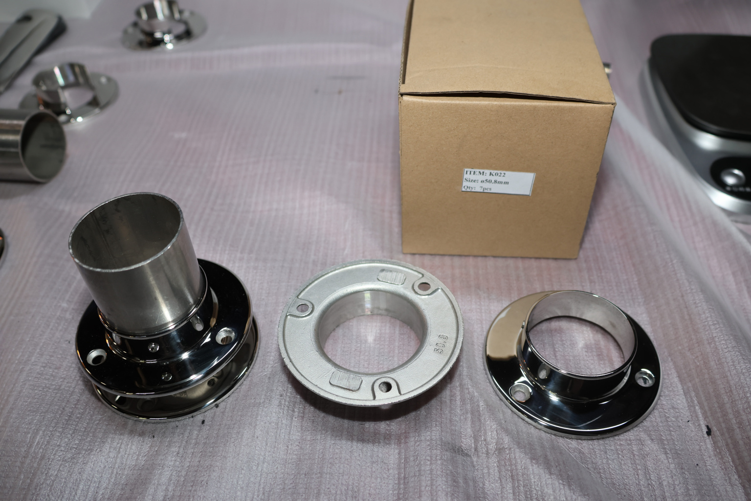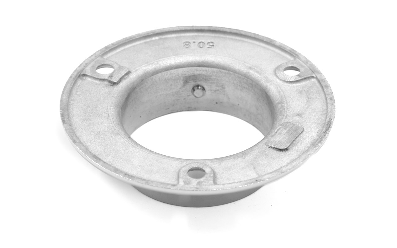 Фланец с тремя отверстиями под 3 самореза 4.8 мм для трубы диаметром 50.8. Деталь литая, полированная. Марка стали - AISI 304