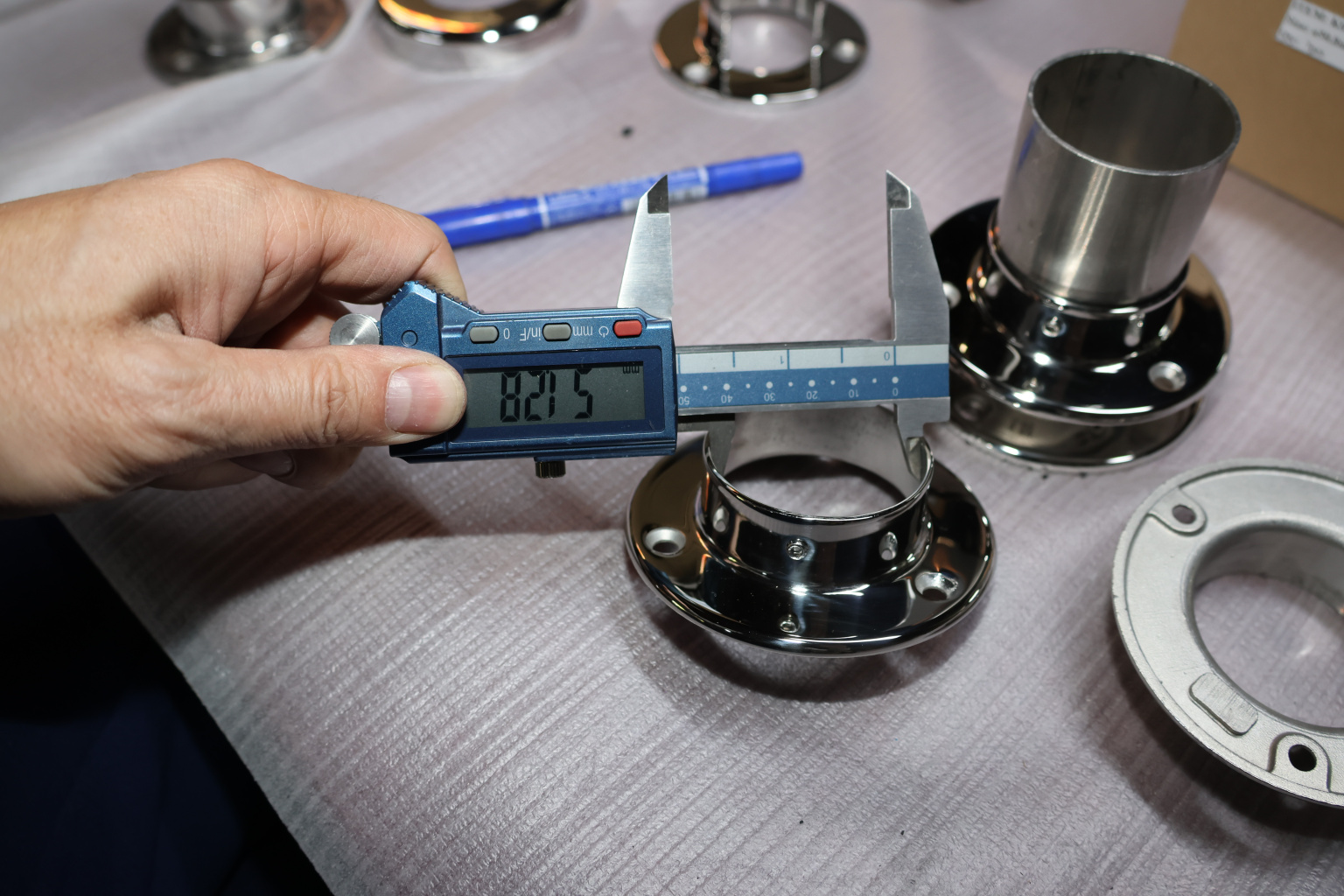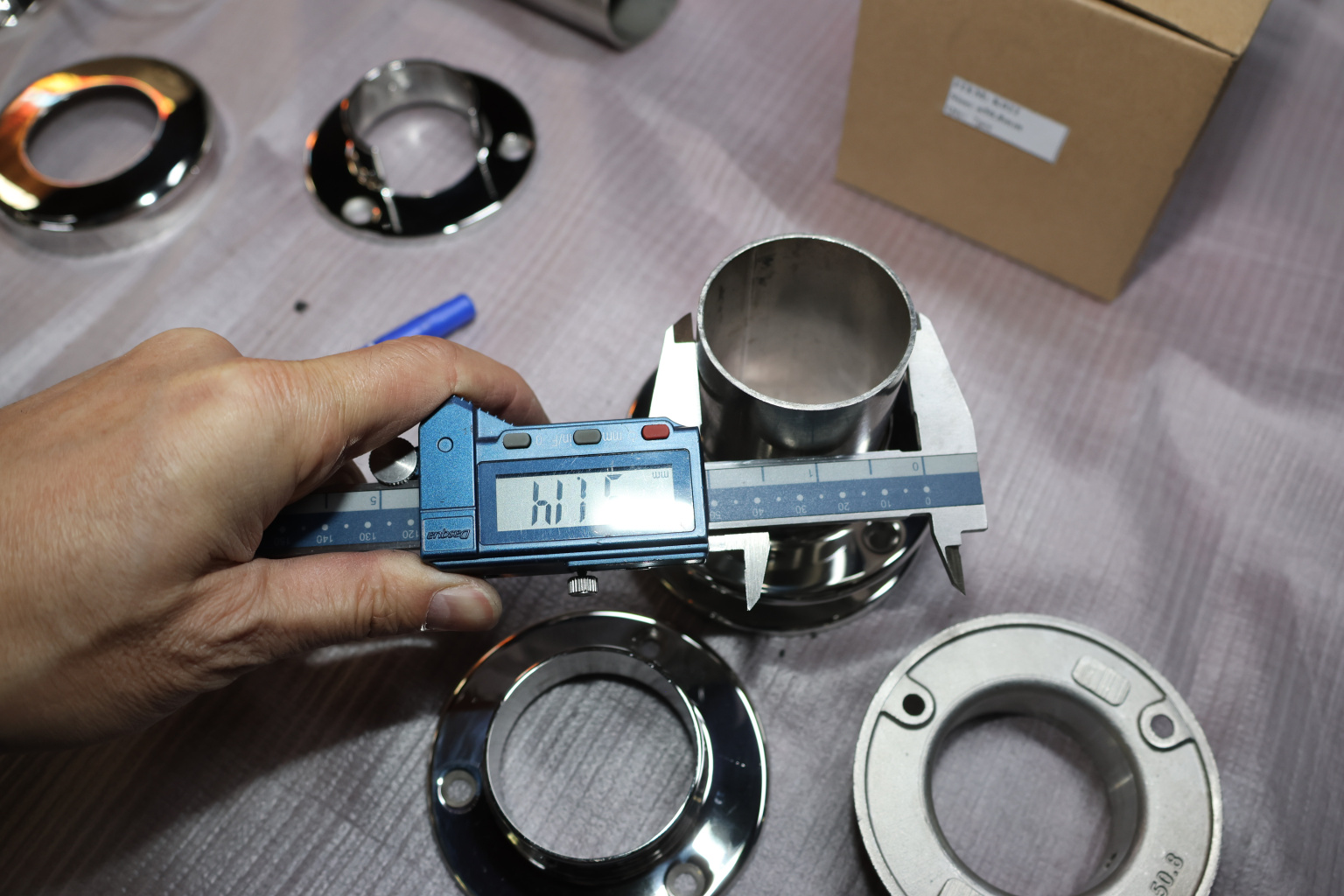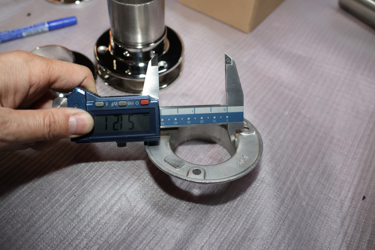 Фланец с тремя отверстиями под 3 самореза 4.8 мм для трубы диаметром 50.8. Деталь литая, полированная. Марка стали - AISI 304