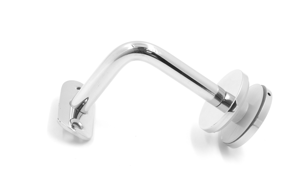 Для установки бокового держателя в стекле сверлится отверстие Ø17 мм, затем пристенок фиксируется затяжной гайкой в торце фланца. А сам поручень приваривается к загнутому наконечнику фитинга.