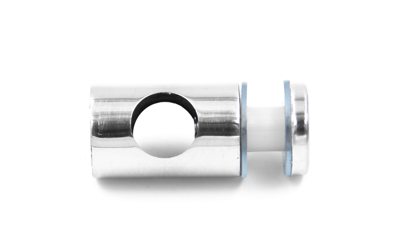 Ригеледержатель крепится насквозь к квадратной трубе стойки, входящим в комплект поставки стяжным винтом М8.Таким образом, с одонй стороны стойки видна шайба, а с другой — корпус ригеледержателя (бочонок) с зажатым внутри него ригелем.
