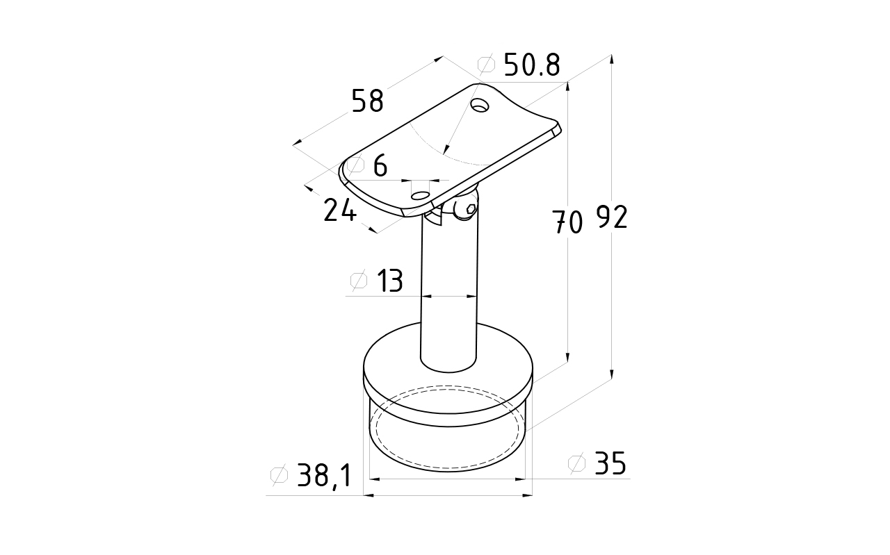 Предназначен для стойки диаметром Ø38.1 мм (k819, k849) под поручень Ø50.8 мм. Деталь с регулируемым ложементом и отверстиями под саморезы. Можно крепить как на сварку, так и на специальный клей (Ф-1105, Ф-1106). На сегодняшний день это наиболее распространенный тип наконечников стоек, повсеместно используемый в монтаже ограждений.