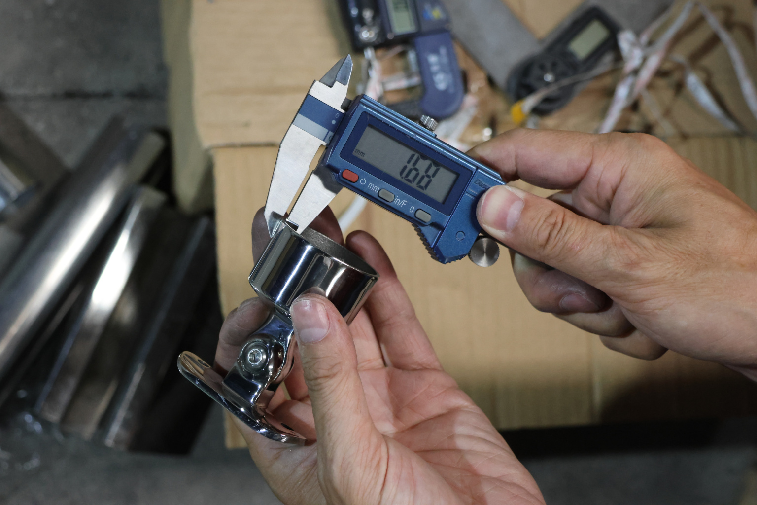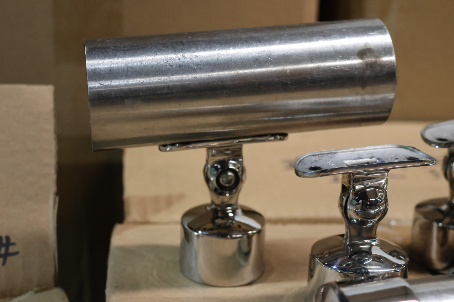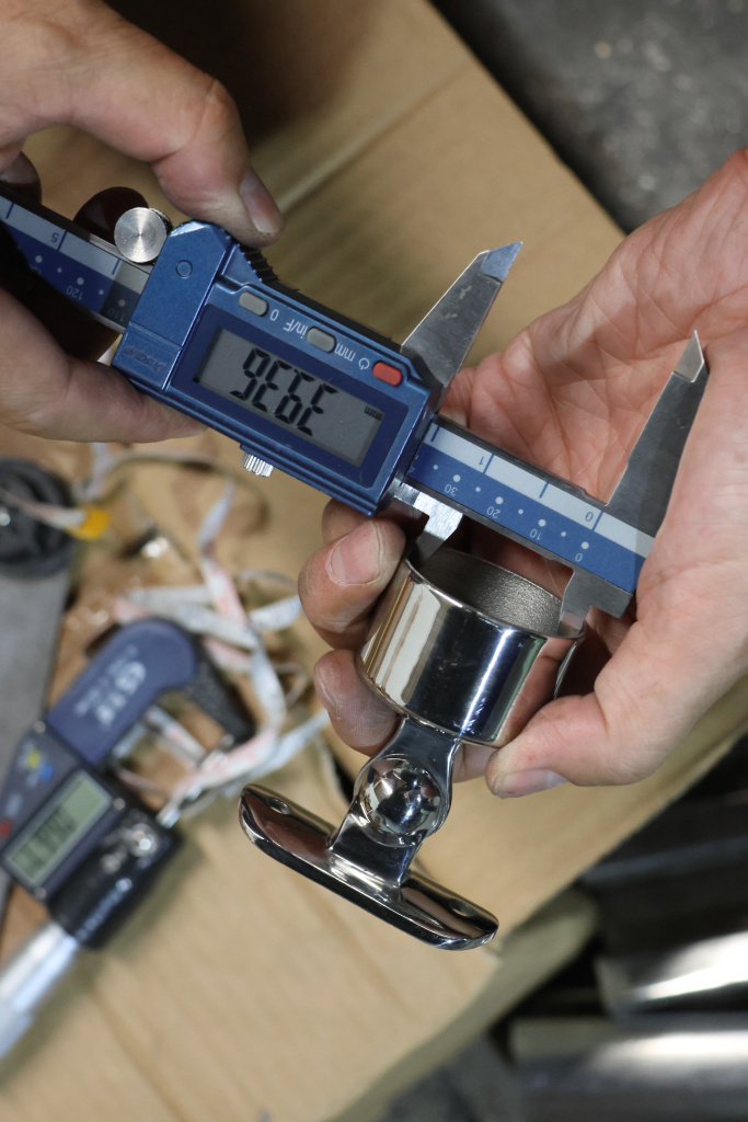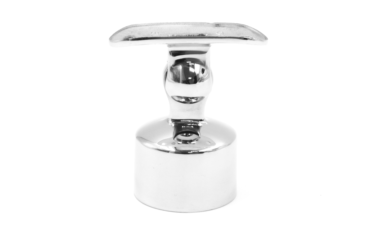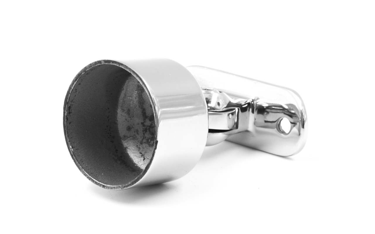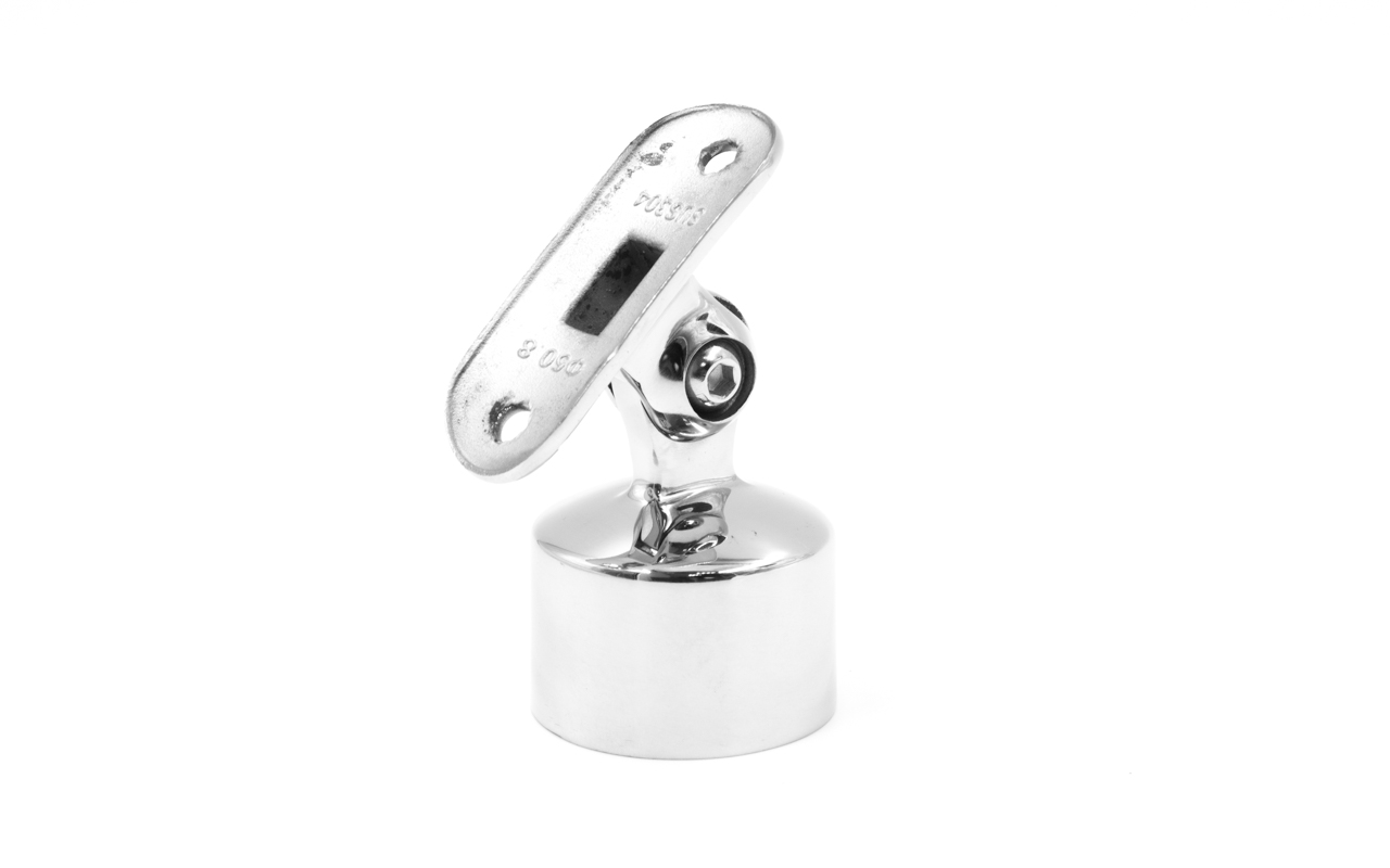 Наконечник шарнирный на стойку Ø38.1 мм, с регулированным ложементом под поручень Ø50.8 мм. Наконечник наружный, литой, полированный. Марка детали - AISI 304