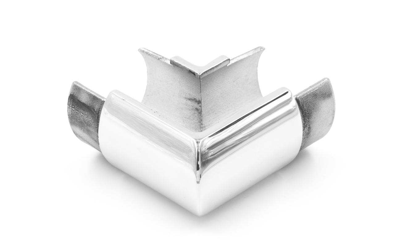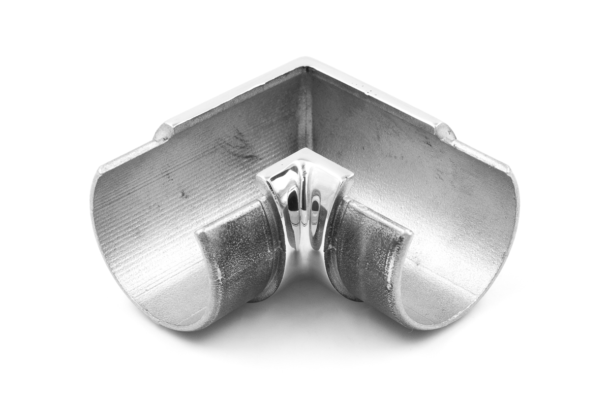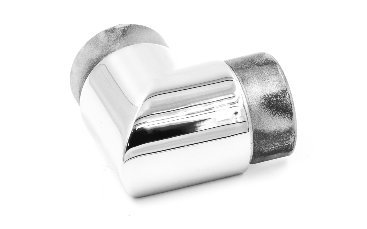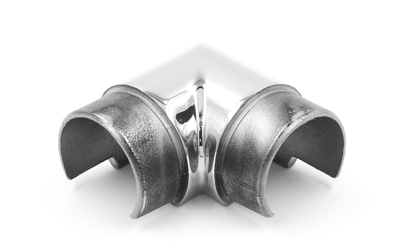 Фитинг предназначен для поворота поручня самосборных ограждений с несущим стеклом под углом 90 градусов в горизонтальной плоскости.