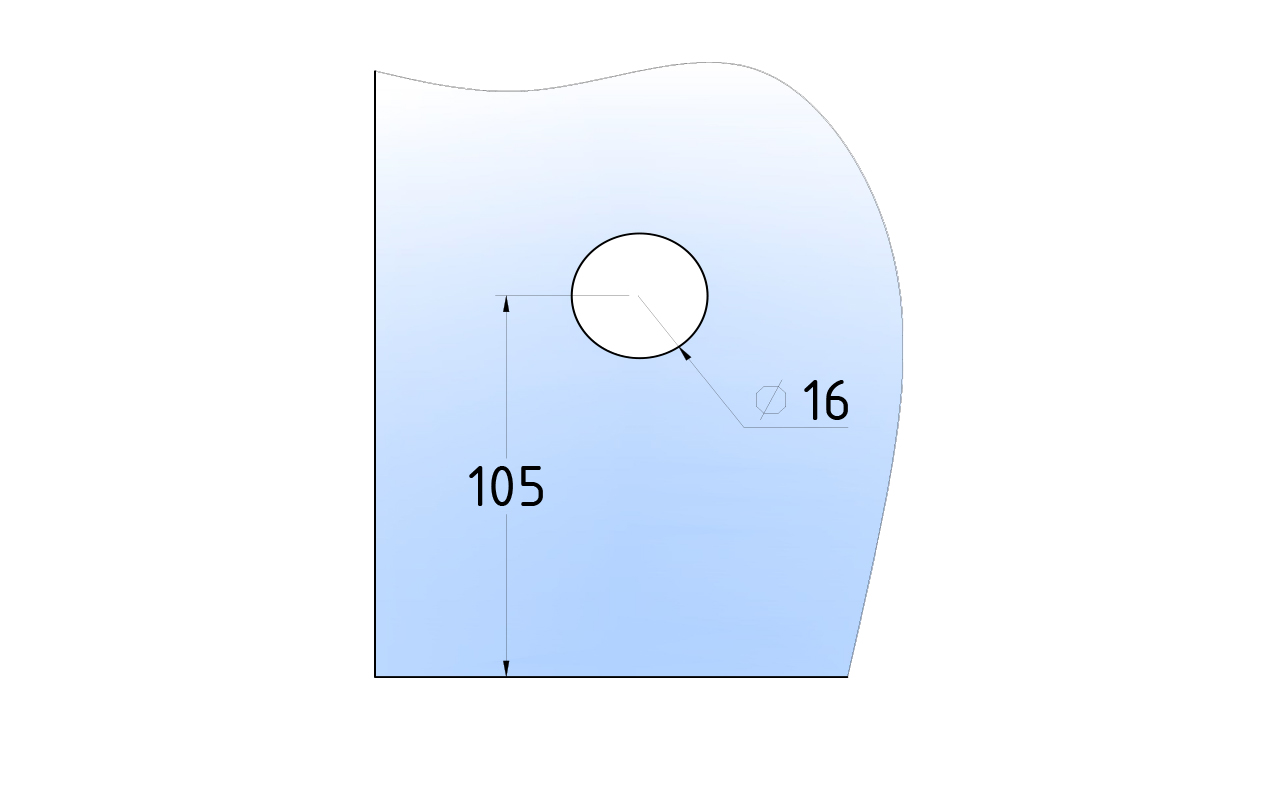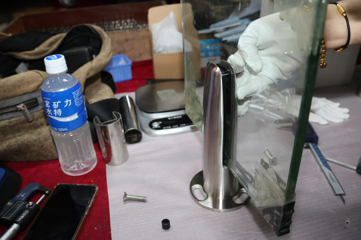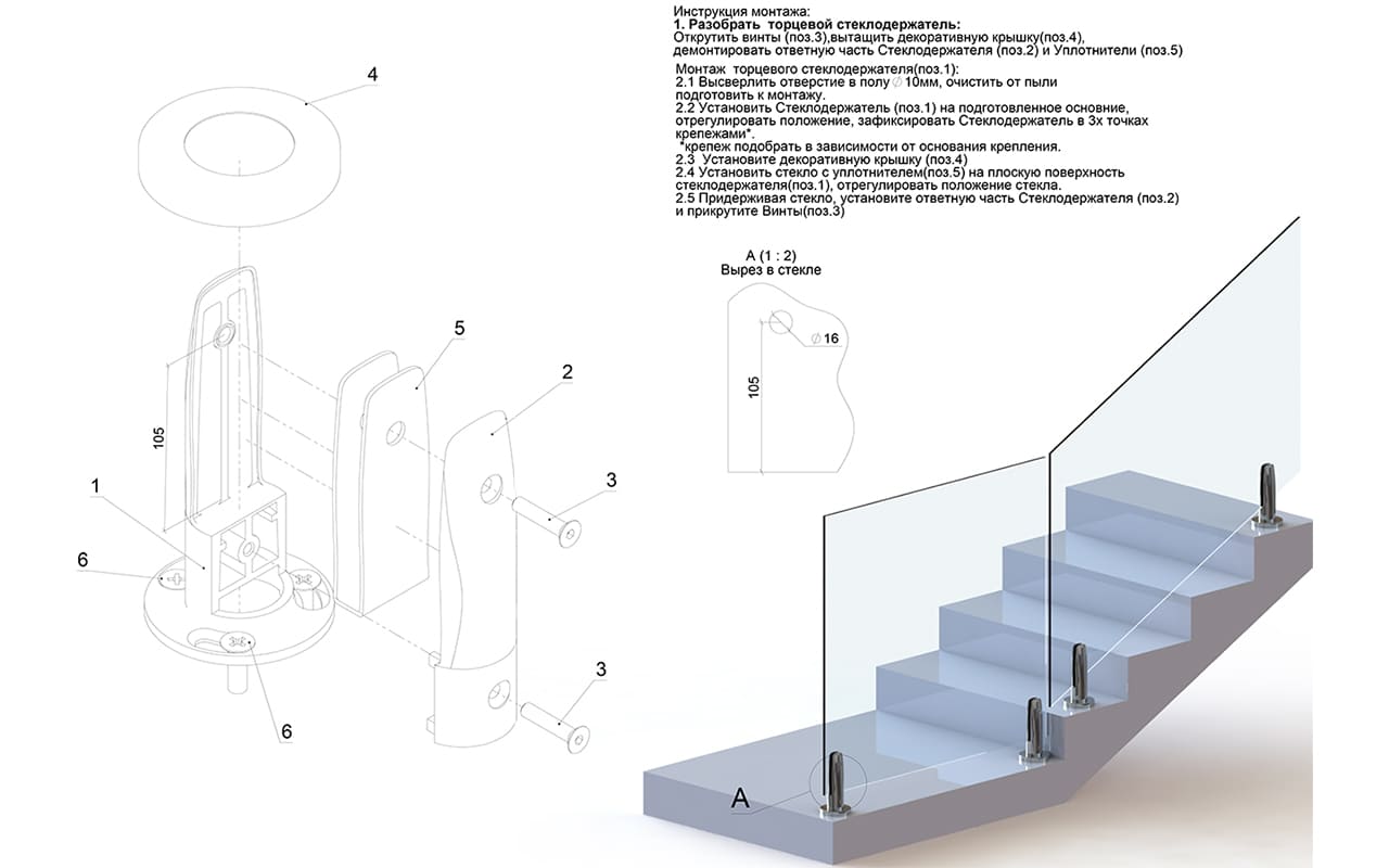 монтируется сверху в пол, через фланец диаметром 100 мм на три крепления с возможностью регулировки, крепеж используется под “потай” и сверху закрывается декоративной крышкой. Для того чтобы смонтировать стекло на стеклодержатель, нужно отверстие в стекле диаметром 16 мм
