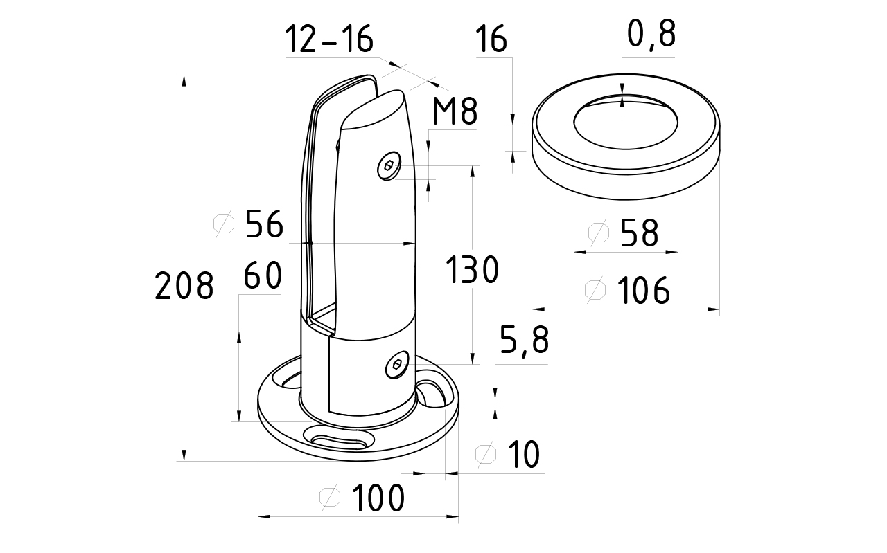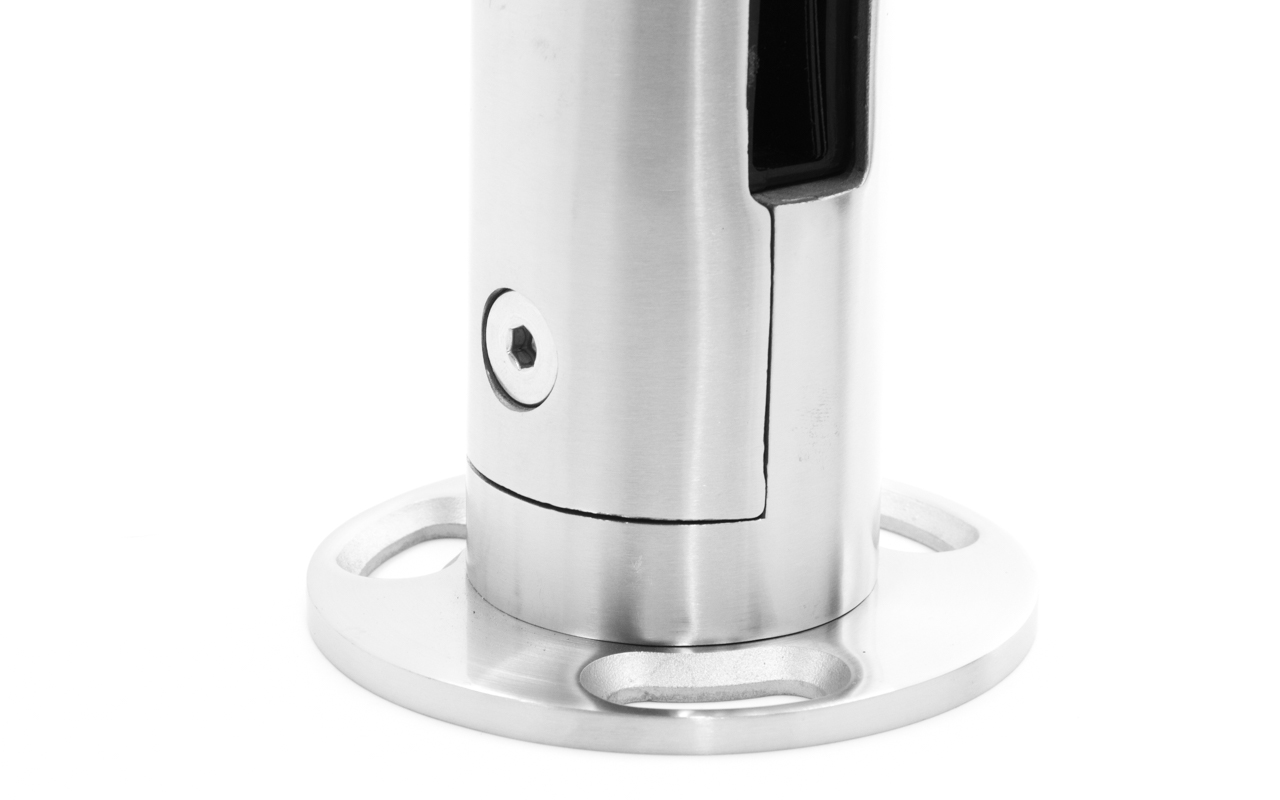 Стеклодержатель литой напольный, круглый, для стекла 12 - 16 мм, шлифованный, марка стали- AISI 304. Так же вам понадобиться для крепежа потайной винт под шестигранник k601-19-120.
