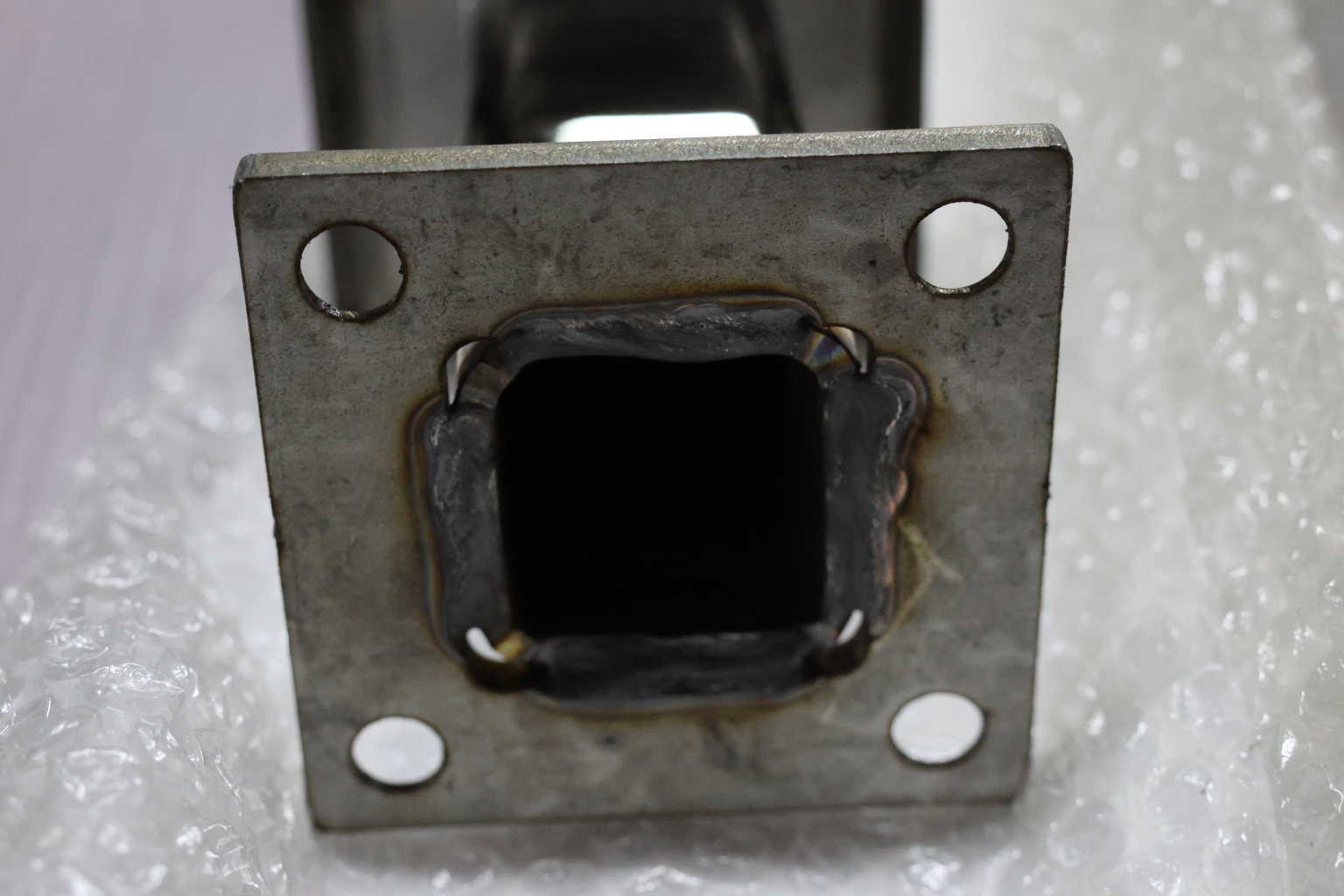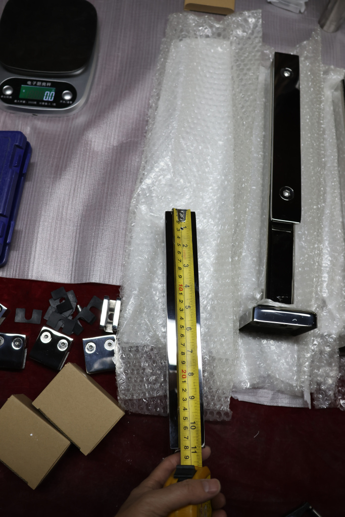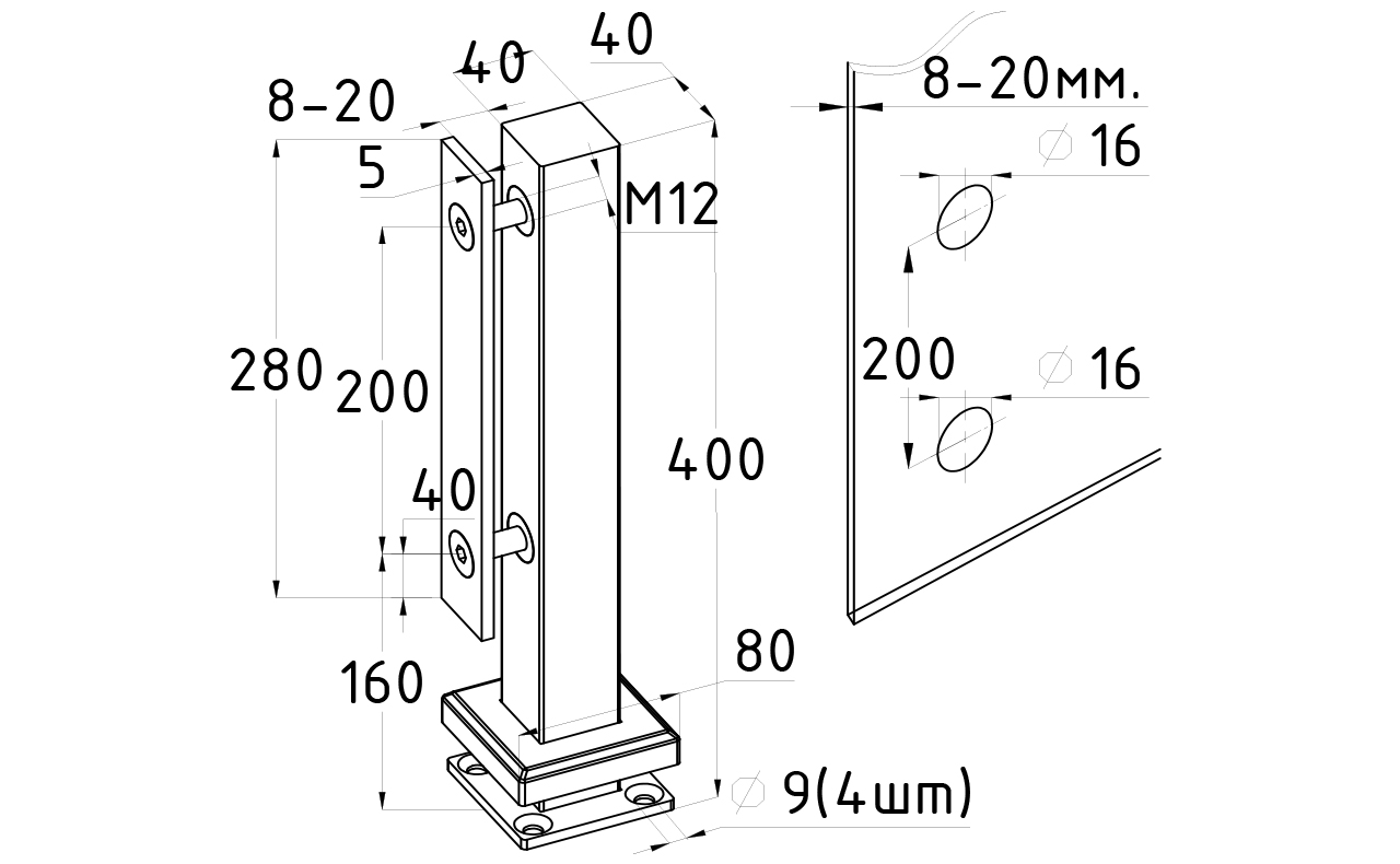 Стойка крепится к полу через отверстия в фланце диаметром 9 мм (4 шт), крепеж выбирается в зависимости от поверхности на которую необходимо смонтировать деталь. Для бетона, это шпилька 8 мм, для дерева, это всевозможные саморезы , которые выбираются в зависимости от толщины породы. Затем устанавливается стекло, через отверстия диаметром 16 мм и фиксируется прижимной пластиной с помощью шестигранника