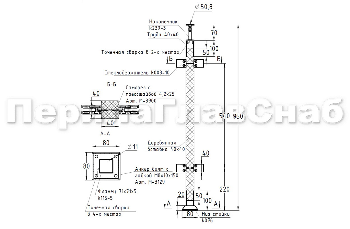 Стойка квадратная 40х40: 2 литых квадратных стеклодержателя, шлифованная, высота 950 мм (AISI 304) k747-2-L/R купить в Перми