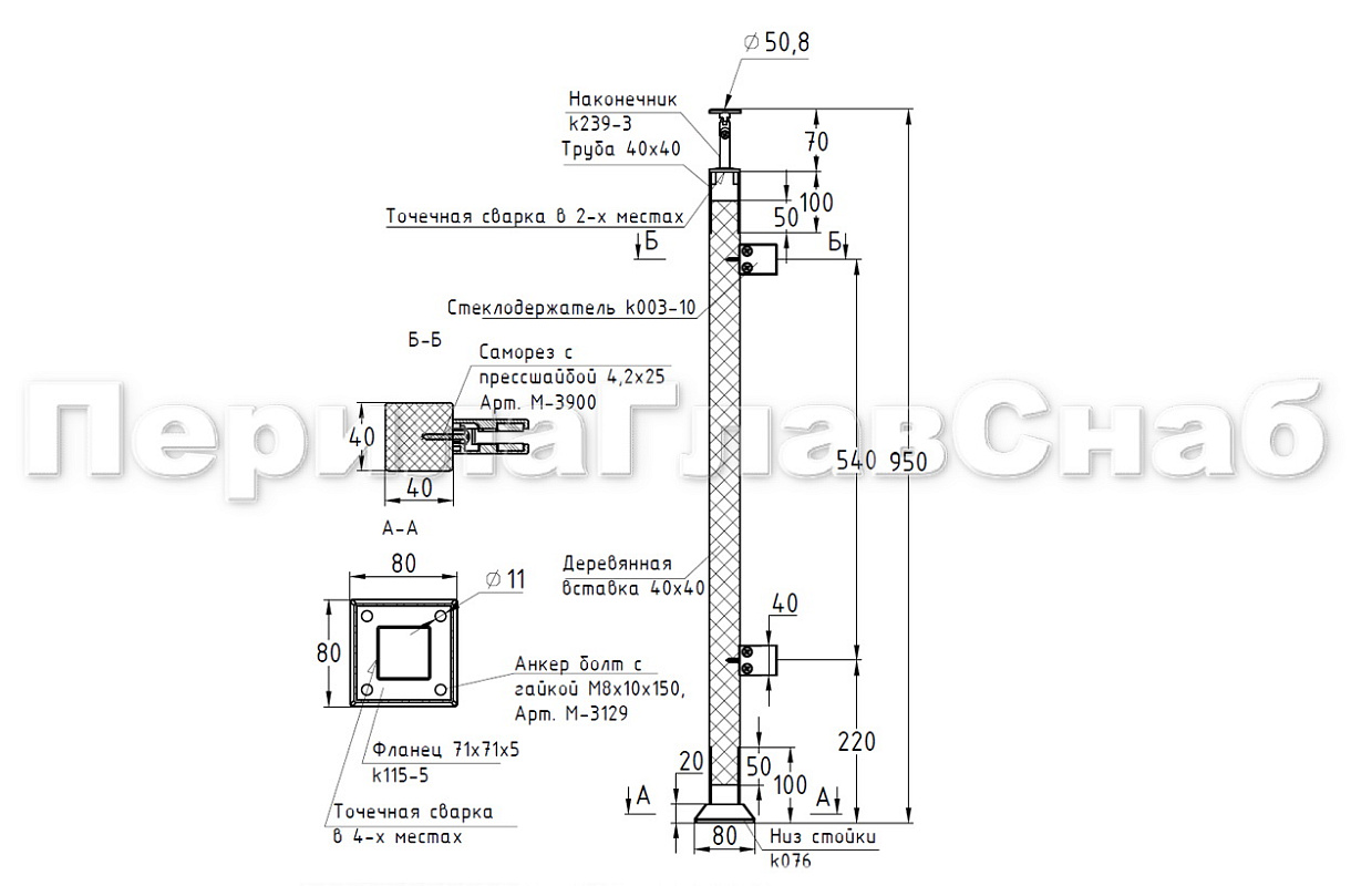 Готовая стойка 40х40х950 мм, деревянная, со вставками из нержавеющей стали 2х100 мм с 3 ригеледержателями k740-1-G купить в Перми