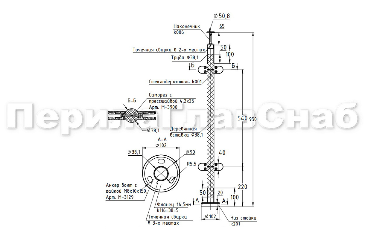 Готовая стойка Ø38,1 мм, с фланцем и наконечником, высота 950 мм, полированная (AISI 304) k702 купить в Перми