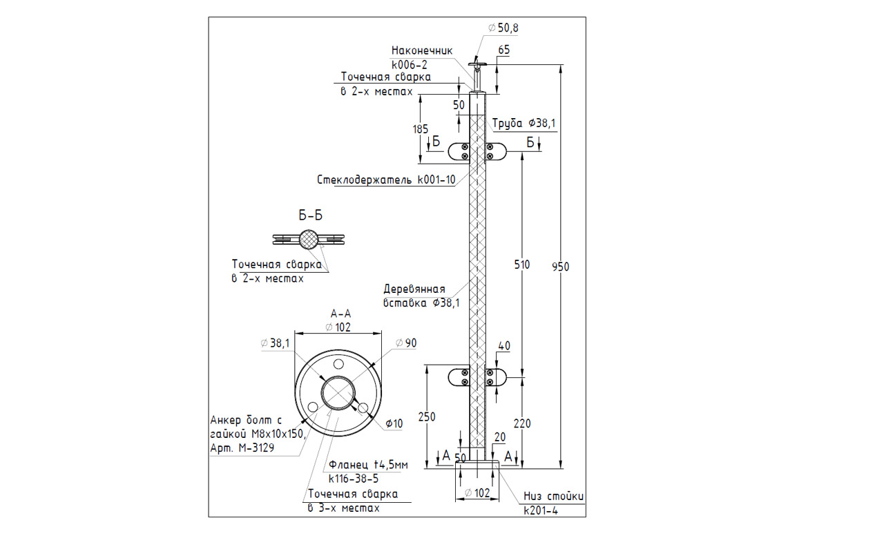 Готовые стойки – это экономия Вашего времени и денег. Приобретая готовую стойку Вы можете собрать ограждение сами, не привлекая монтажную бригаду и экономя денежные средства на монтаже. Стойка легко монтируется к полу благодаря треханкернуму фланцу с отверстиями под анкер-болт М8 ( , , ) или шпильку ( ; ) комплекте с хим анкером Ф-0799 или Ф-0800., а крепеж скрывает декоративная крышка идущая в комплекте стойки. Поручень из нержавеющей стали можно закрепить при помощи самореза ( , , ), либо при помощи заклепки ( ) и винта М6 ( М-3973) что на порядок эффективней, для крепления при помощи заклепок необходимо растачивать отверстие в ложементе. Если вы используете пластиковый ( , , , , , , ) или деревянный поручень, то его можно закрепить при помощи саморезов ( , М-3850, )). После покраски дубовой проставки подклеиваете клеем ( ф-1127, ф-1105). Стекло заказывается после установки стоек и снятия размеров. После того, как стекло готово к установке, при помощи шестигранника ( , ) разъединяете стеклодержатель, надеваете стекло и закручиваете обратно. Ограждение готово!