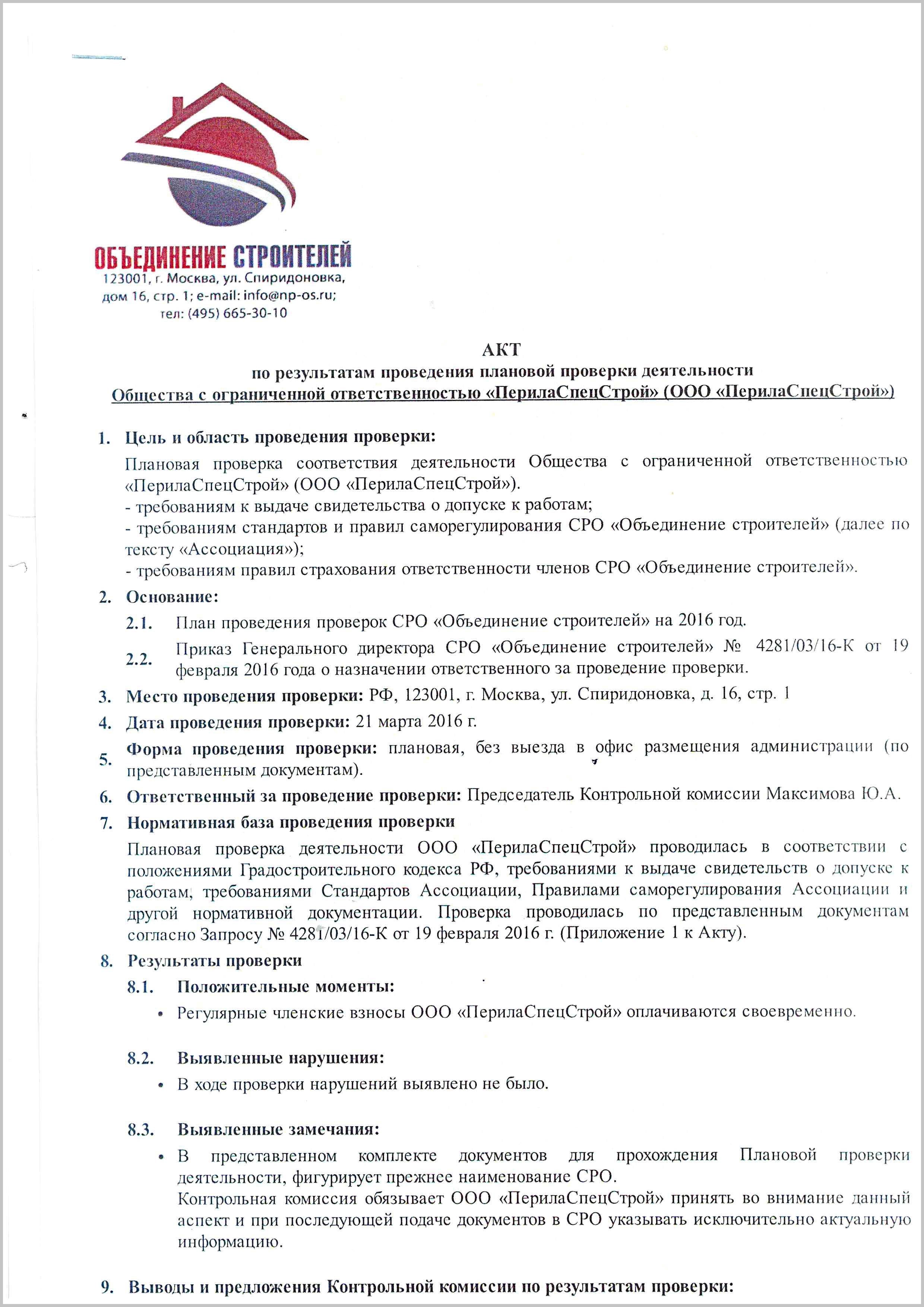 Дисциплинарная комиссия СРО "Объединение Строителей" провела очередную плановую проверку деятельности компании "ПерилаГлавСнаб" (31 марта 2016) на соответствие: