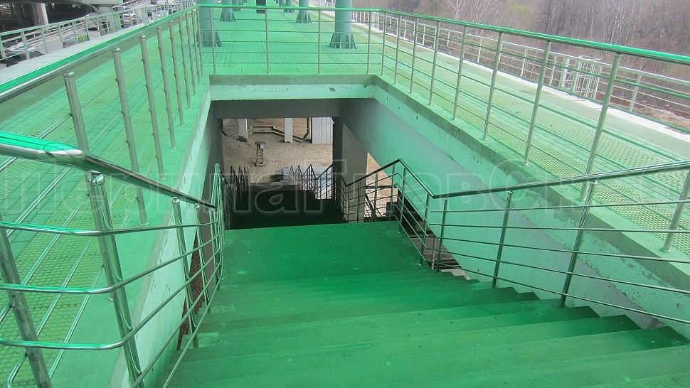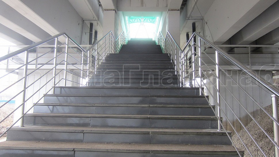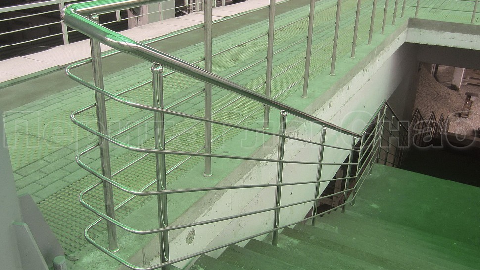 Компание ПерилаГлавСнаб были установленны отбойники на витражи из полированной нержавеющей стали. Труба диаметром 50мм устанавливается в два ряда на высоте 900мм и 1000мм и крепится к вертикальному импосту витража на саморезы через фланцы, изготовленные из листа 1,5мм. Гнутые выносные элементы из прутка 10мм привариваются к фланцам и трубе, сама труба завязана на поворотакх, ее окончание исполнено в форме “бублик”. Крепление нержавеющих элементов между собой произведено при помощи аргонно-дуговой сварки, с последующей зачисткой и полировкой.