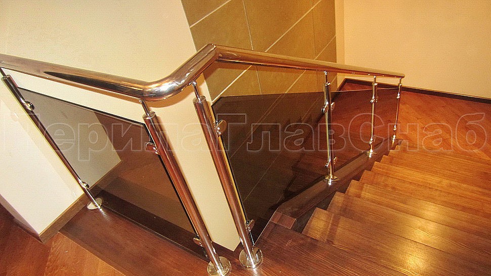 Стекло крепится к стойкам на зажимных стеклодержателях из полированной нержавеющей стали. Верх стойки штырь, низ стойки декоративная крышка. Окончание поручня заглушка.