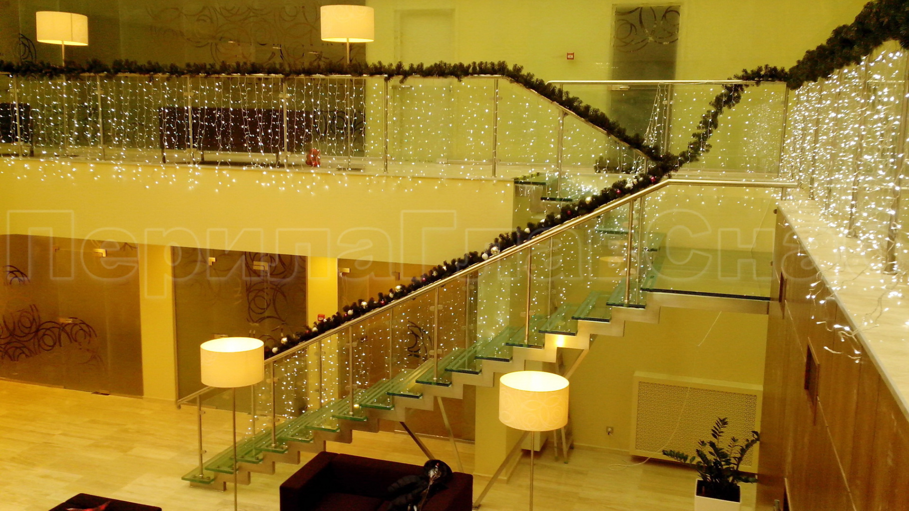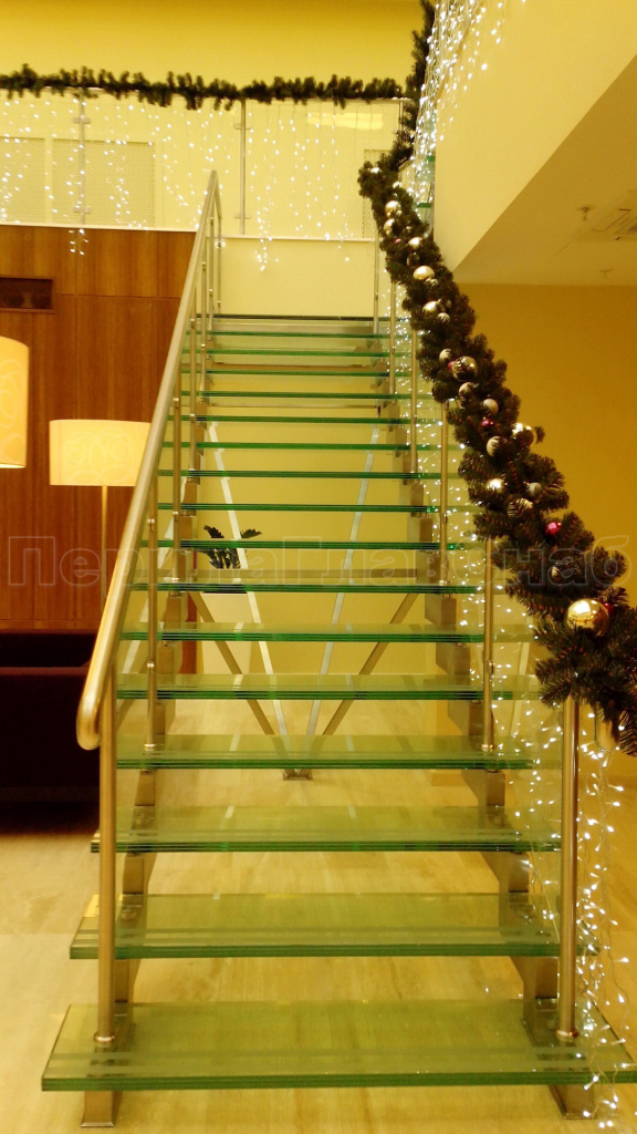 Ограждения лестниц на несущем стекле с подсветкой в Перми. Готовые проекты ПерилаГлавСнаб