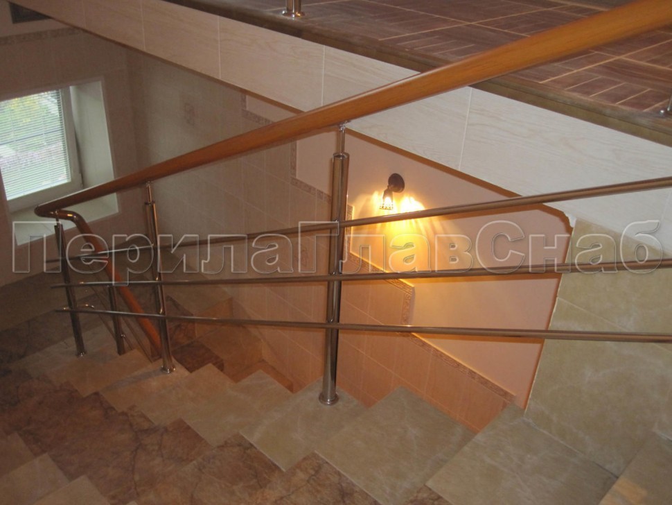 Нержавеющие ограждения без ригелей с круглым деревянным поручнем и стойками с деревянными вставками