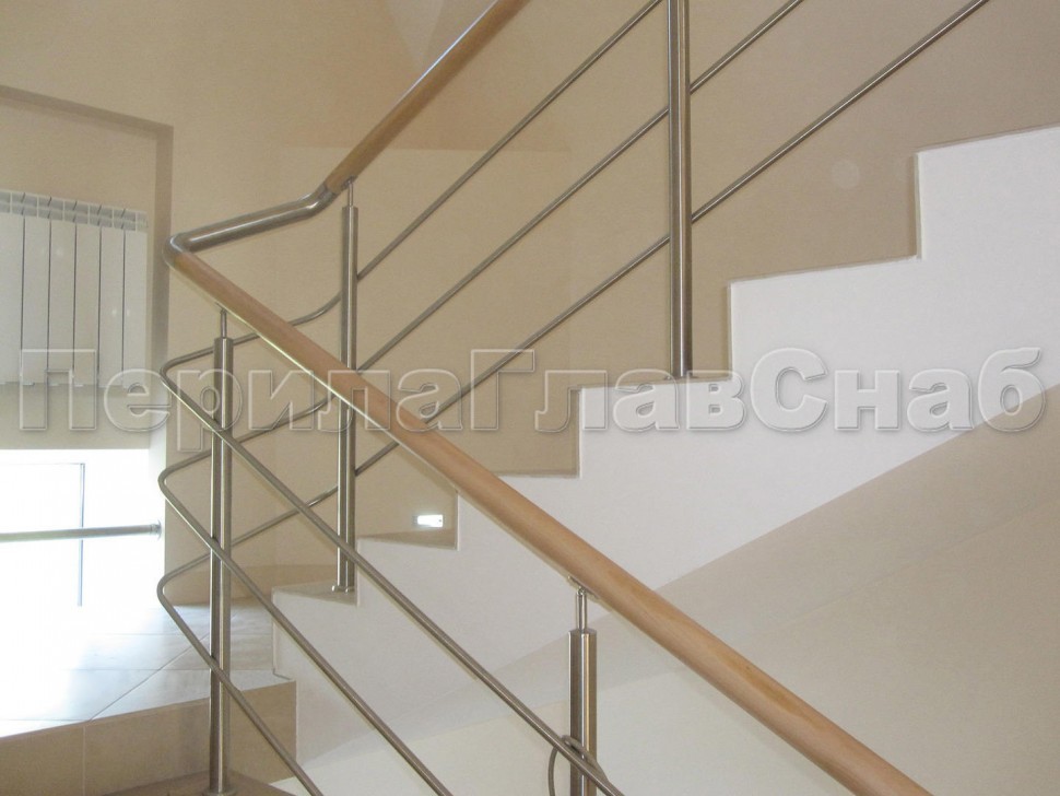 Три ригеля на сварке, квадратный деревянный поручень и круглые стойки