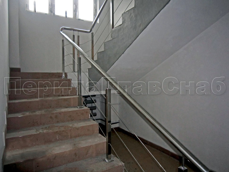 Ограждения из нержавейки. Заполнение из 4х тросиков. Квадратные стойки.