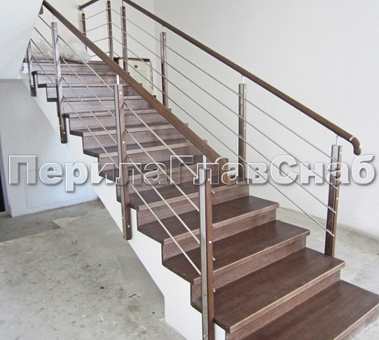 Четыре ригеля на держателях, квадратный деревянный поручень и стойки с деревянными вставками