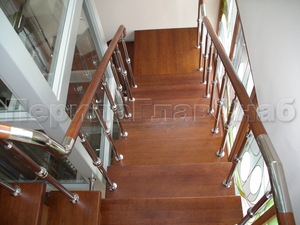 Ограждения с двумя стойками в каждую ступень с деревянным поручнем и без ригелей