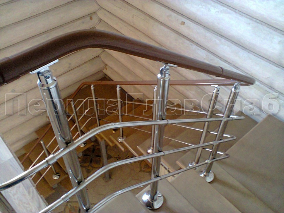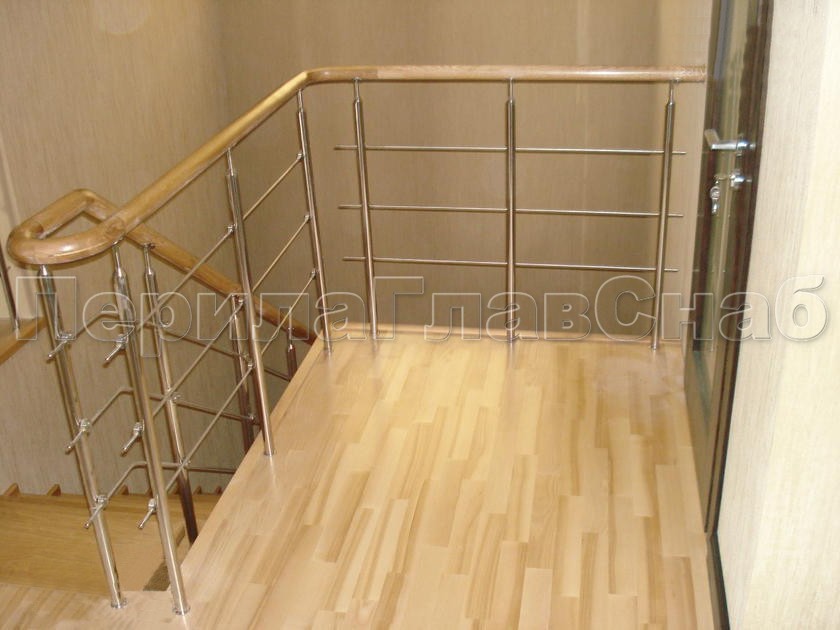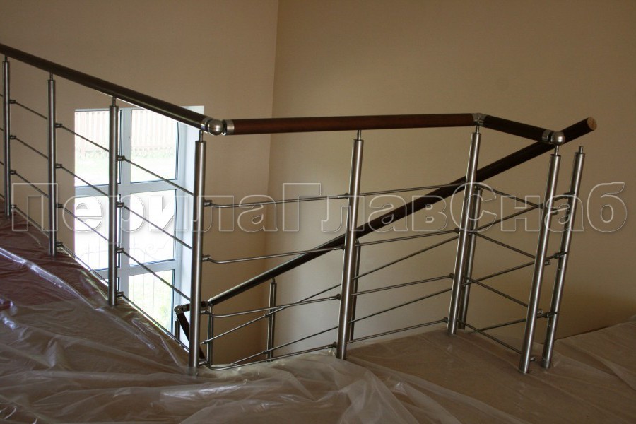 Нержавеющие ограждения без ригелей с круглым поручнем и стойками с деревянными вставками