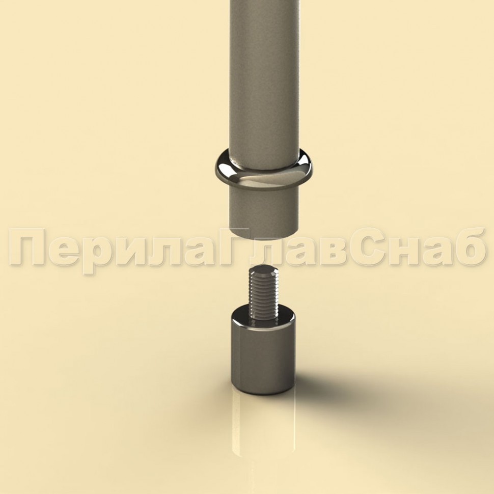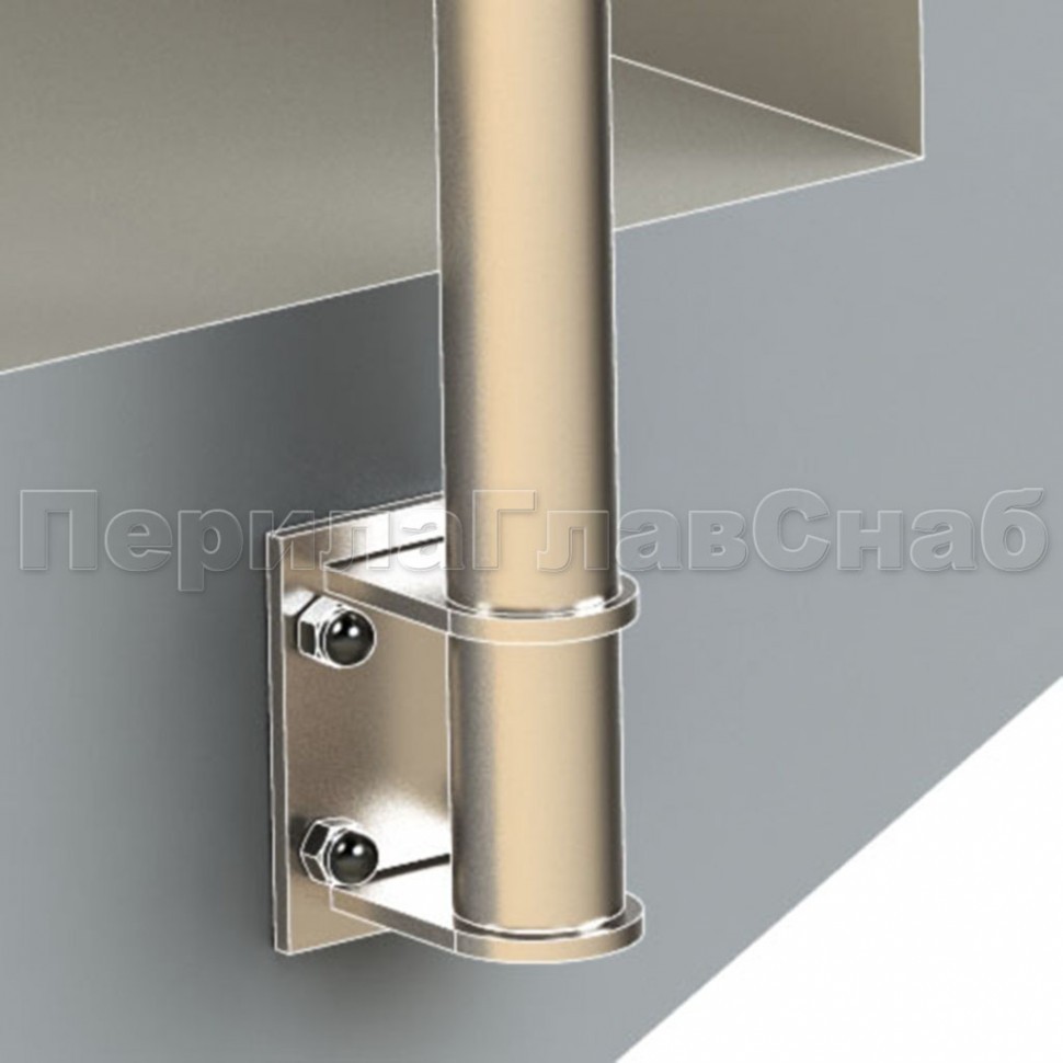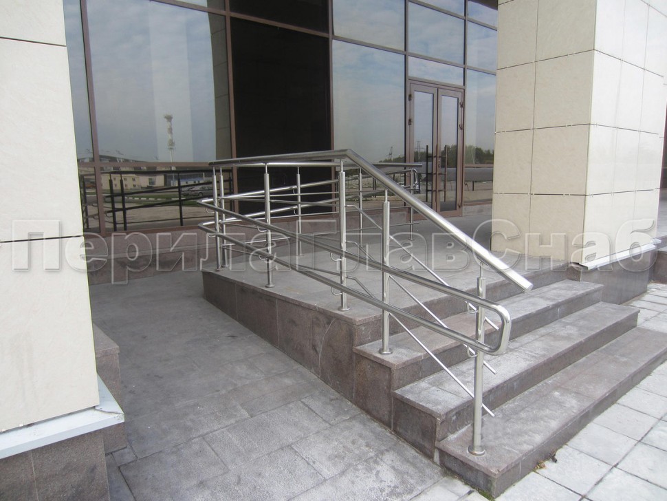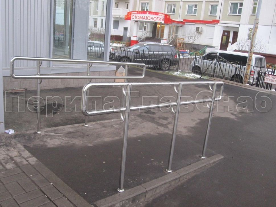 сдвоенный, из круглой нержавеющей трубы диаметром 38,1 мм. Нижний и верхний поручни завязаны при помощи отводов. Поручень может крепиться на выносные держатели.