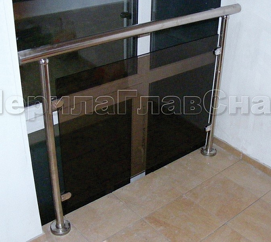Ограждение лестницы со стеклом, тонированным в массе, стойки и завязки поручня из латуни