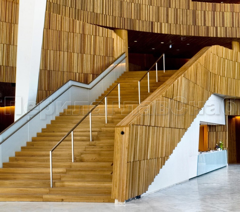 Ограждения с двумя стойками в каждую ступень с деревянным поручнем и без ригелей