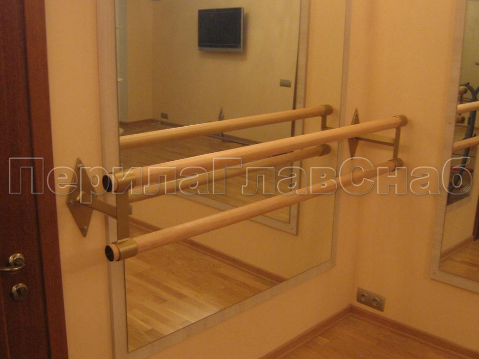 Два ригеля на держателях, круглый деревянный поручень и круглые стойки
