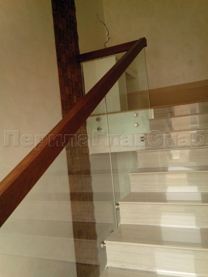Ограждение с деревянным поручнем на точечном креплении на лестнице