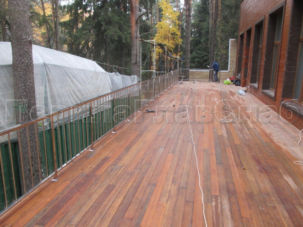 Три ригеля на сварке, квадратный деревянный поручень и круглые стойки