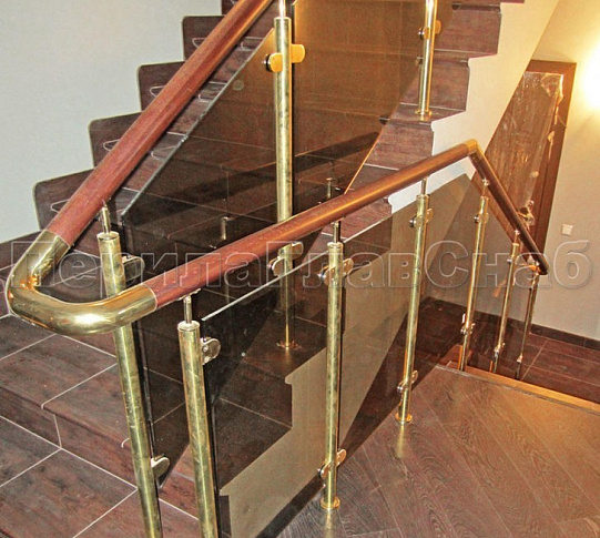 Ограждение лестницы со стеклом, тонированным в массе, стойки и завязки поручня из латуни