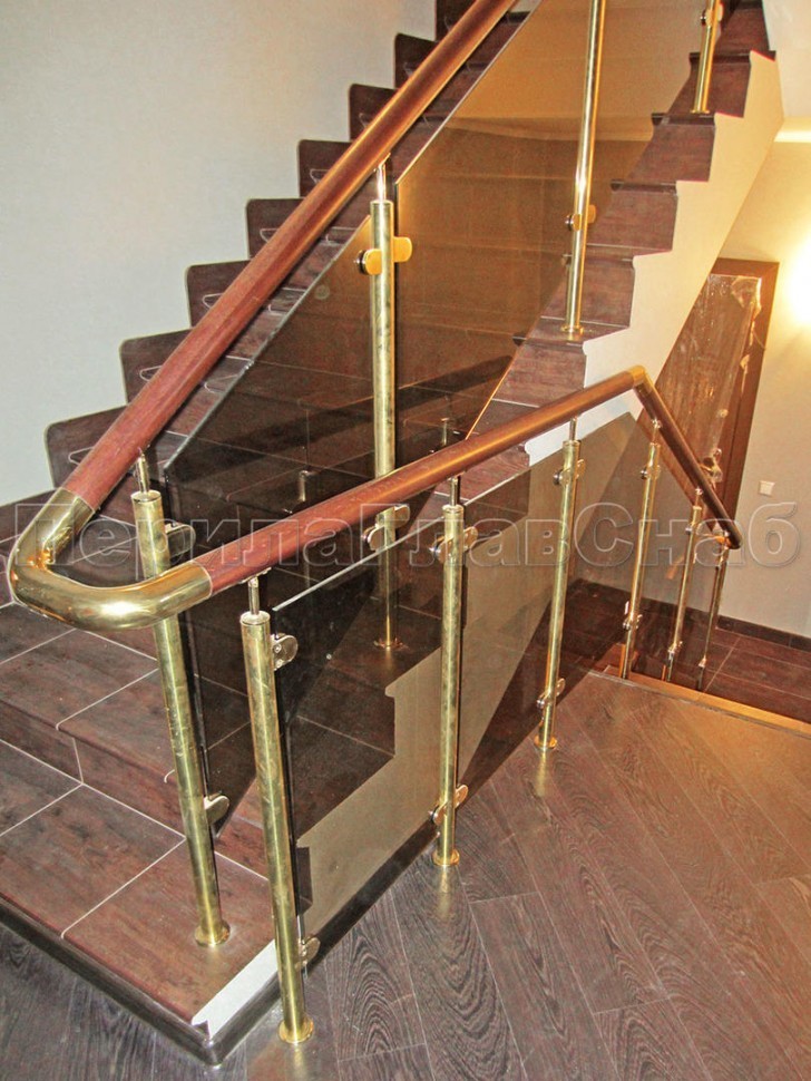 Ограждение лестницы со стеклом, тонированным в массе, стойки и завязки поручня из латуни