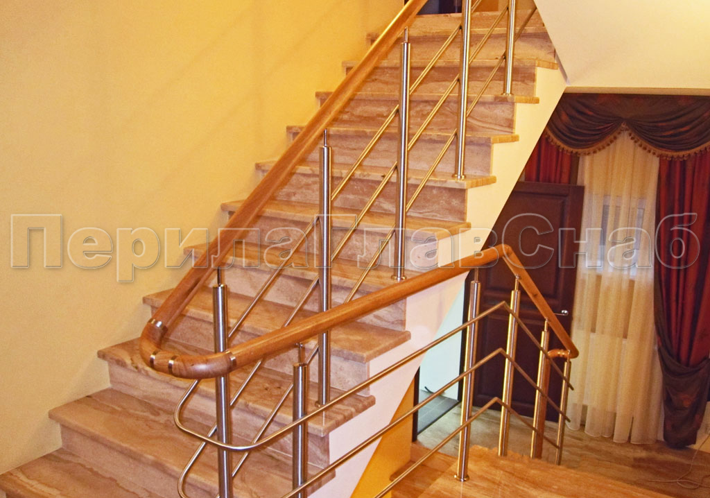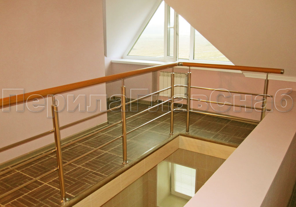 Три ригеля на сварке, квадратный деревянный поручень и круглые стойки в Перми. Готовые проекты ПерилаГлавСнаб