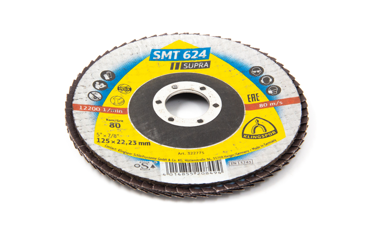 Ф-1139 Шлиф. диск "лепесток" 125х22 Р-80 Клиншпор. Модель SMT624 лепесткового торцевого круга диаметром 125 мм соответствует высшим критериям качества, производительности и безопасности при обработке кромки и зачистке сварного шва изделий из нержавеющей стали.
