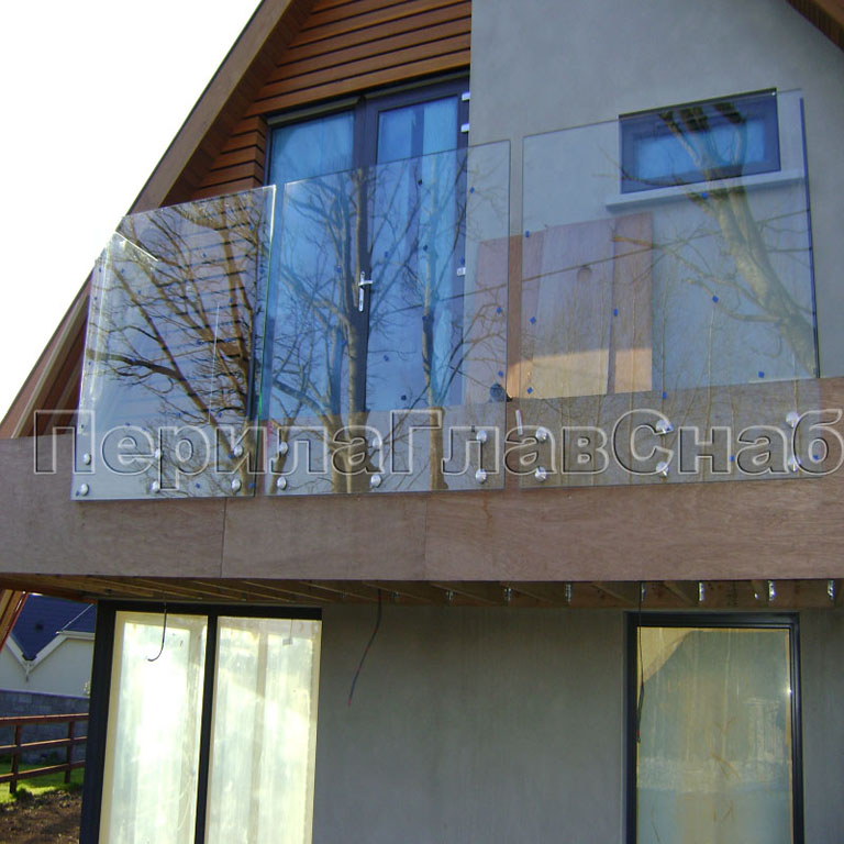 Стеклянное ограждение для балкона без стоек. Крепление на точках. Поручень - труба с пазом.
