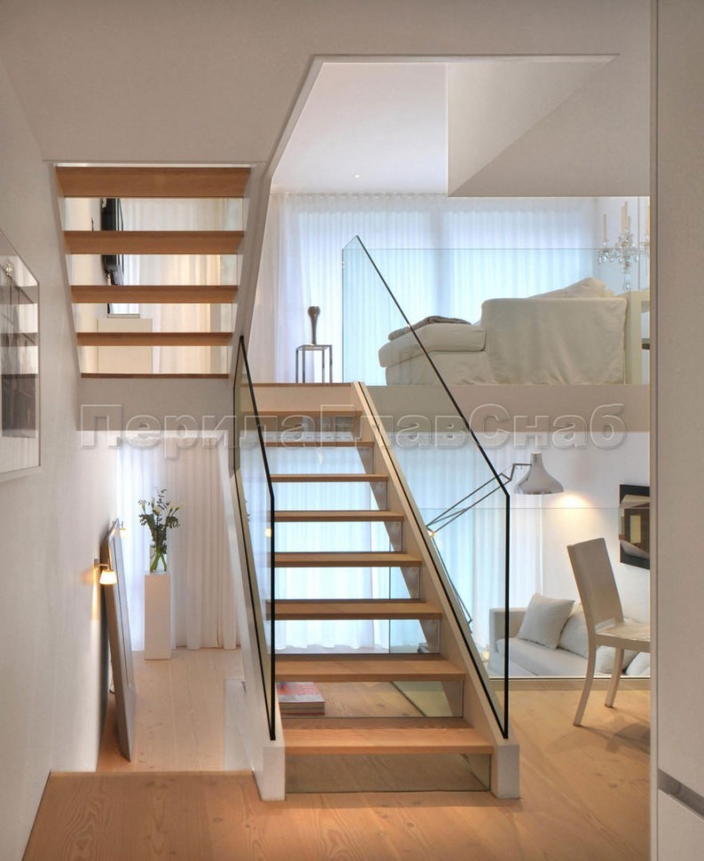 Ограждение с деревянным поручнем на выносе на точечном креплении на лестнице