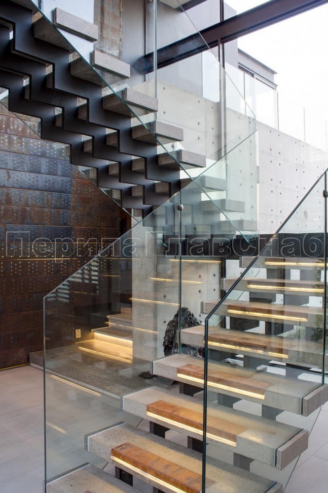 Ограждения лестниц на несущем стекле с подсветкой