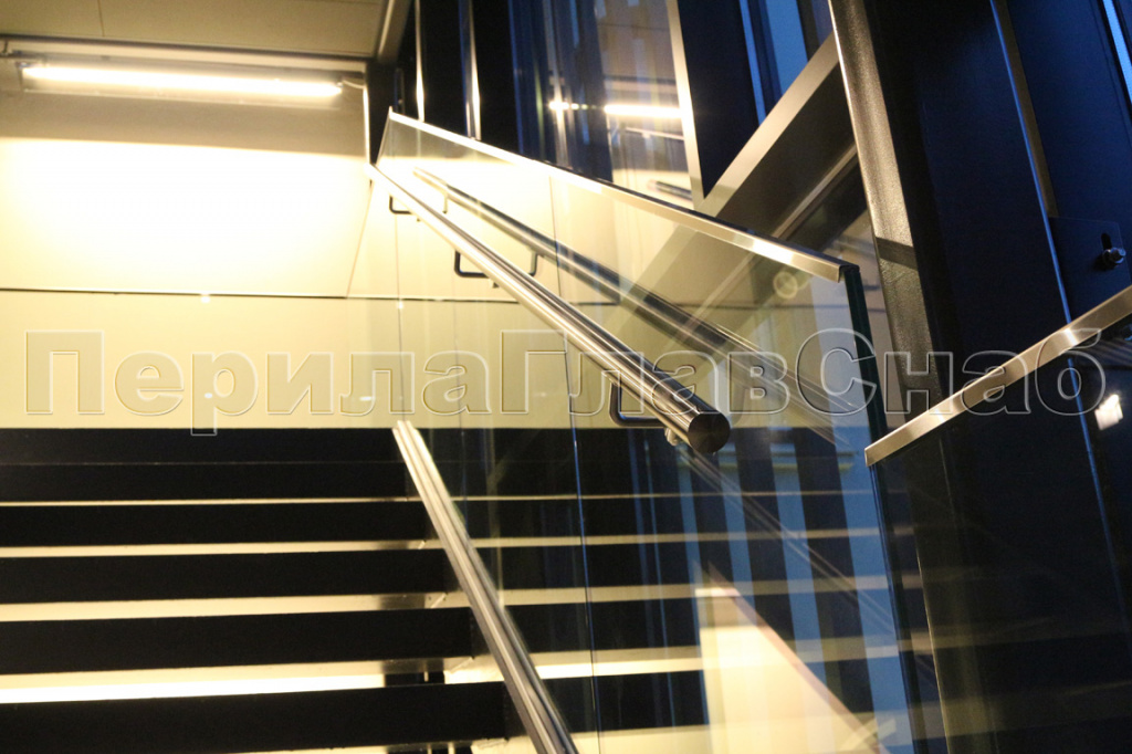 Ограждения лестниц на несущем стекле с подсветкой в Перми. Готовые проекты ПерилаГлавСнаб