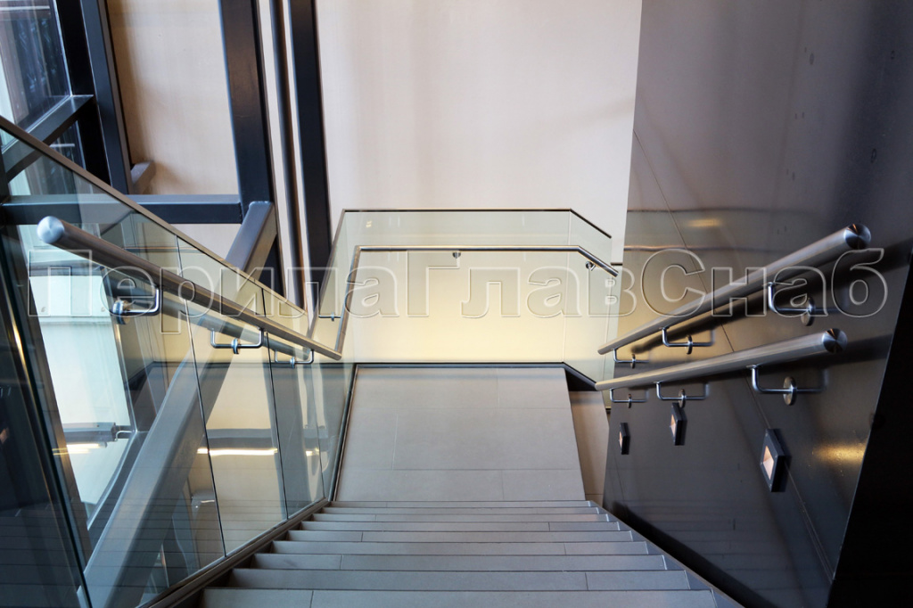 Стеклянное ограждение для косоурной лестницы в офисе производственной фирмы.