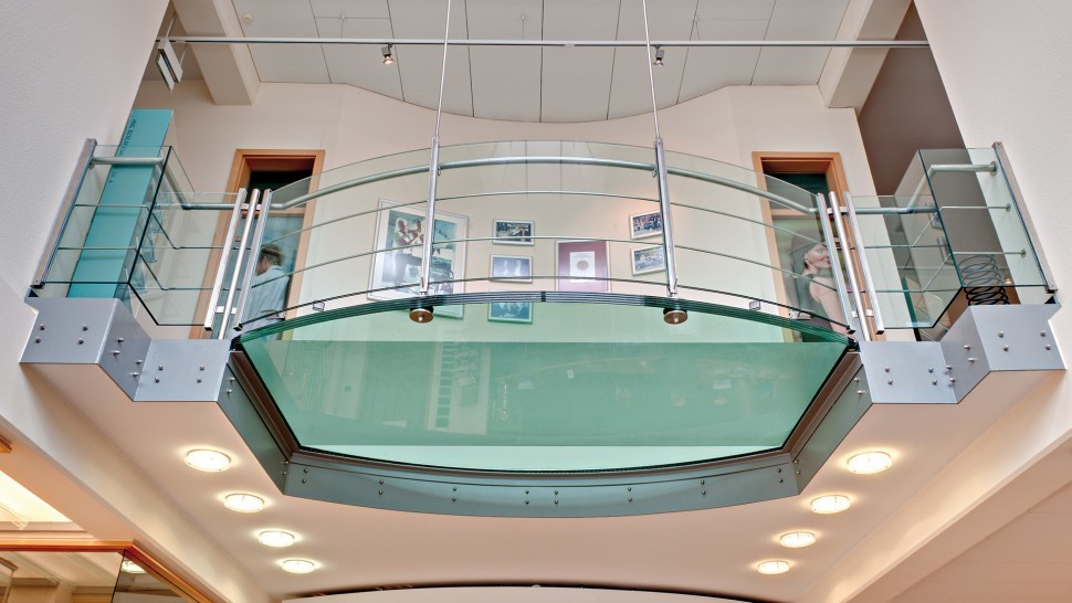 Для изготовления применяются многослойные стеклянные панели, соединенные по технологии триплекс. Это обеспечивает гарантию прочности, визуальной легкости и надежности.