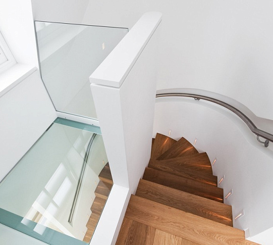 Стеклянные ступени и стеклянная площадка на лестнице